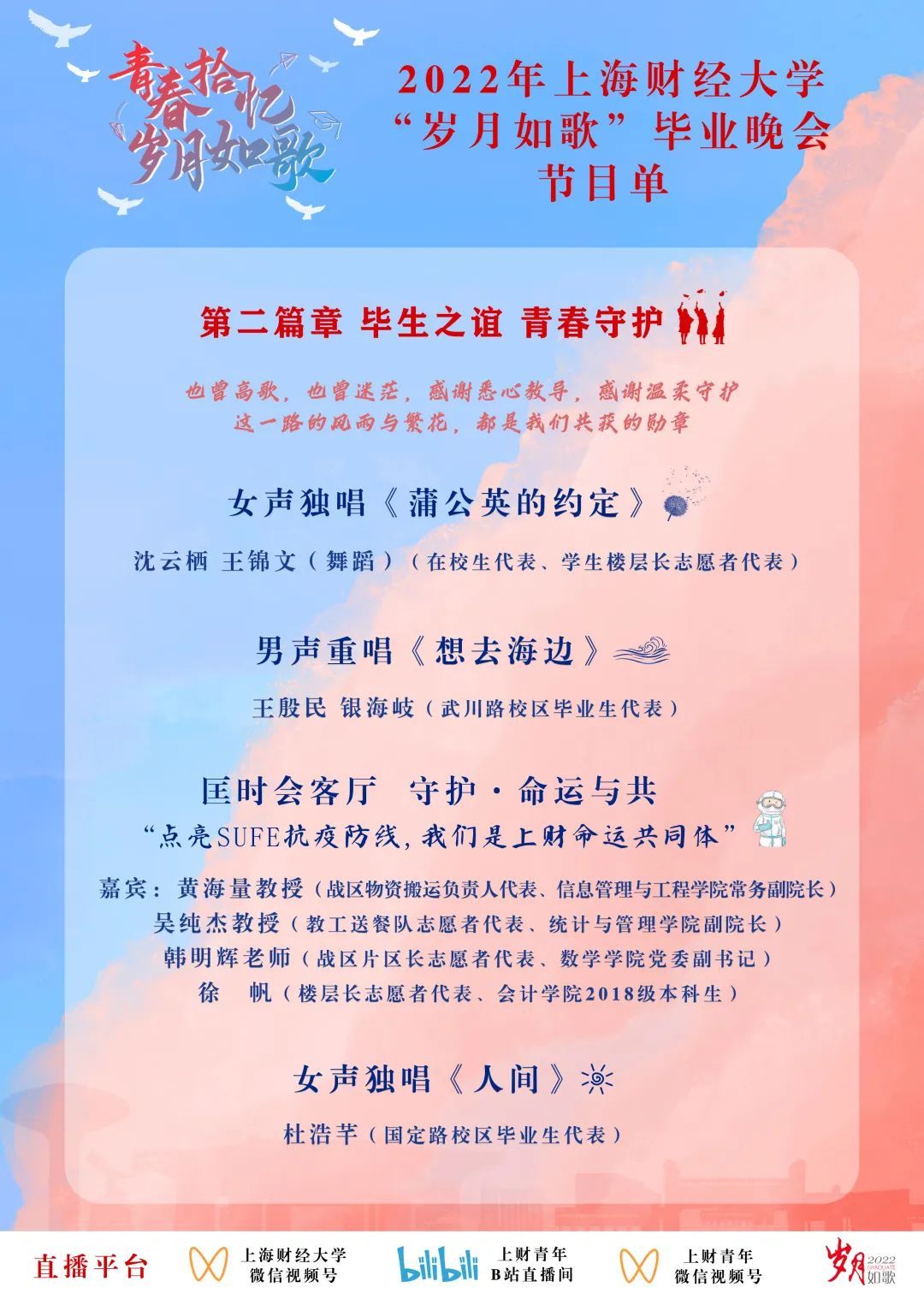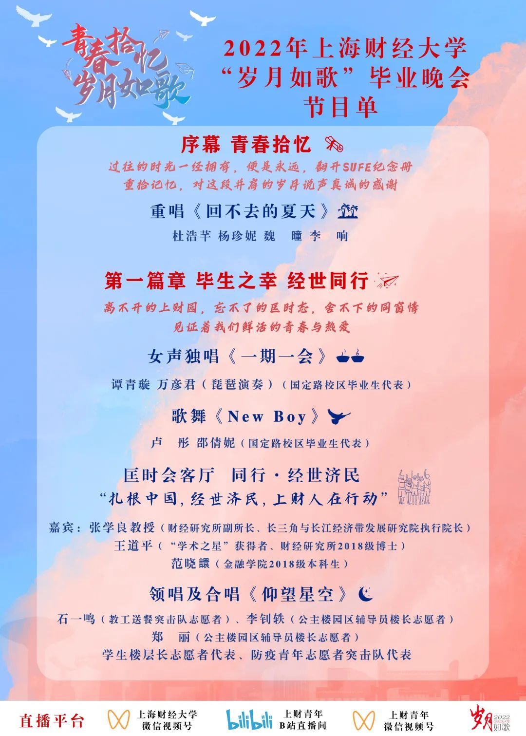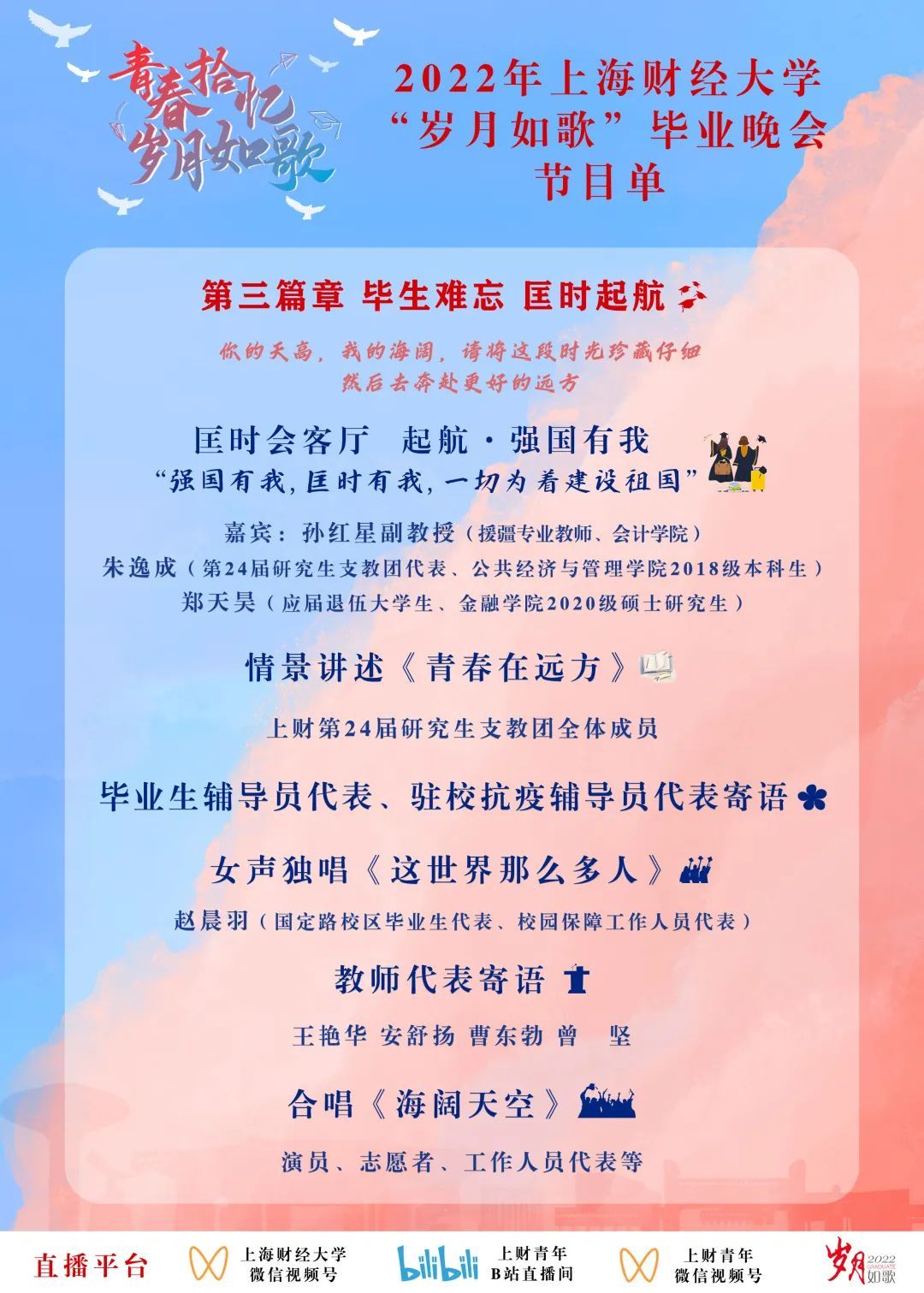 《回不去的夏天》《蒲公英的约定》《海阔天空》等一首首熟悉的旋律,将带你重拾青春的记忆;朝夕相伴的辅导员们和后勤阿姨大叔们将送上临别叮咛和暖心祝福;“匡时会客厅”的嘉宾们将与你云端相遇,来一场属于上财人的思维碰撞。