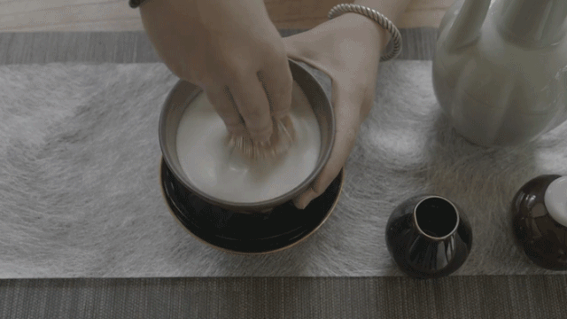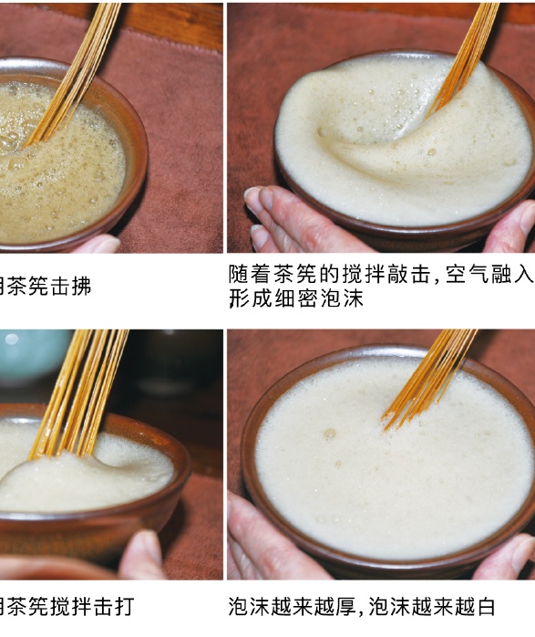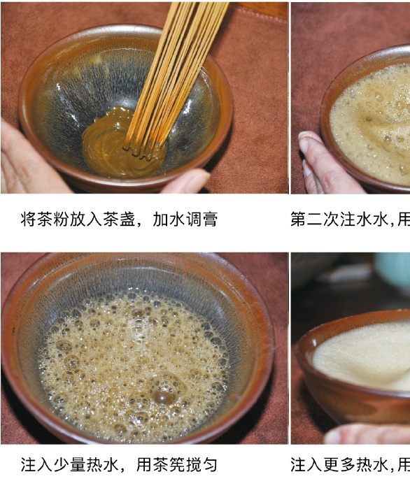 点茶的工艺复杂,有蒸青、漂洗、压榨、揉匀、压成茶砖、再焙干、捣碎,碾末,筛粉等标准工序。得到茶粉还不算晚,放入碗底加水打出厚沫,才算一碗合格的宋茶。