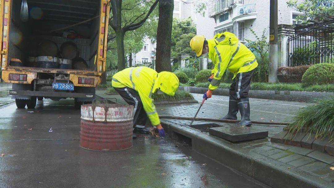 一早,几位水务养护人员已在雨中忙开了,他们及时清理地势低洼路段的积水,清除道路两侧排水口的枯枝落叶等杂物,确保道路通畅。闵行区排水管理所设施管理科科长许文斌形象地介绍道:“排水口是雨水通往雨水管网的入口,它就像人的嘴巴一样,不能被杂物堵住,而雨水管网就像人的肠道,再通往到泵站,通过泵站实现放江入河,确保道路不积水。”