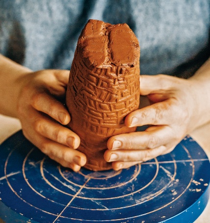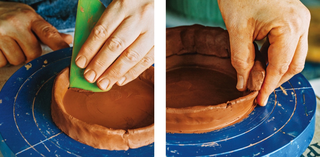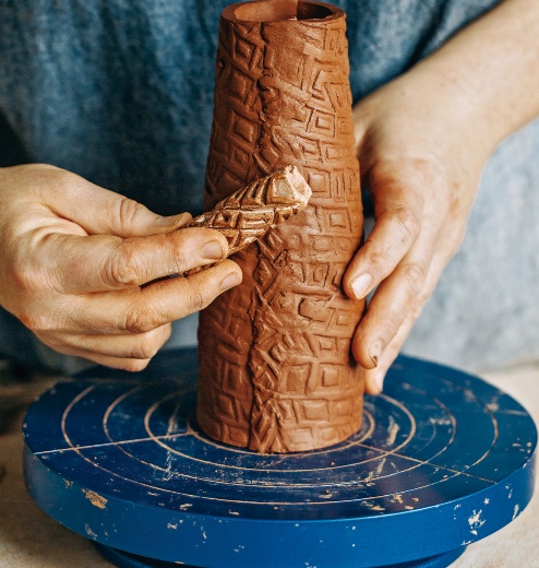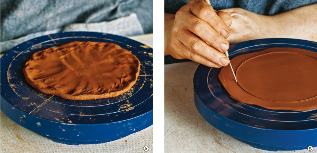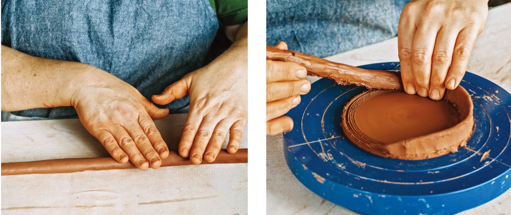 按压泥块,厚薄均匀表面光滑后,划出底座,准备泥条,一圈一圈按压塑形,盘旋而上。