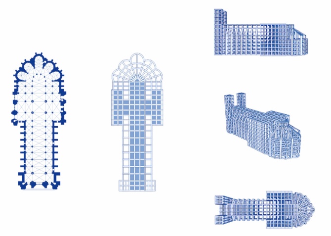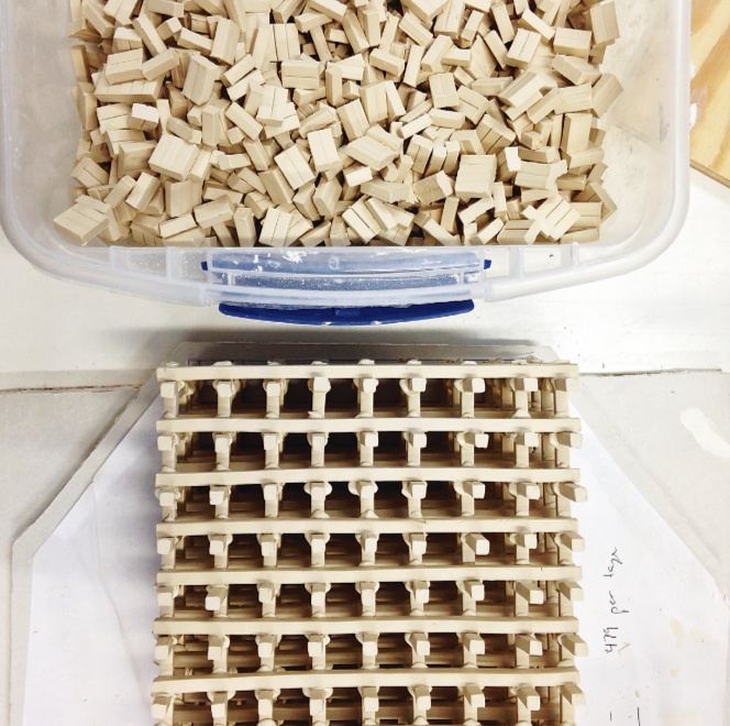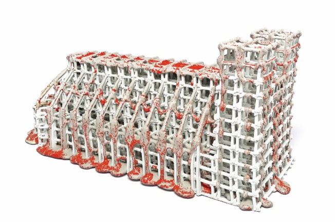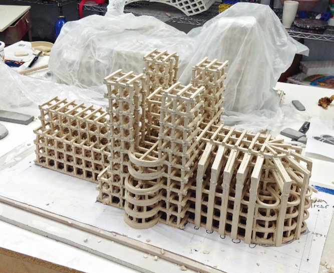 “最近的作品是哥特式大教堂。我花了大量时间寻找历史图片,研究原始建筑是如何建造的,了解建筑内每个区域的象征意义,然后我用电脑模拟出教堂的抽象版本。我没有创作出原作的微缩版本,而是创作了一个引用了其来源的雕塑。计算机建模为我提供了许多有利条件。我用挤泥机来制作雕塑的组成部分,并制作了一些模具,以协助这一过程。因为需要3 000~4 000 块零件,我想不出其他的方法来提高组件的效率。”