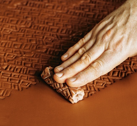 制作厚薄均匀的泥板,压花,根据模板裁切,包裹模具,封边收口,取出模具。