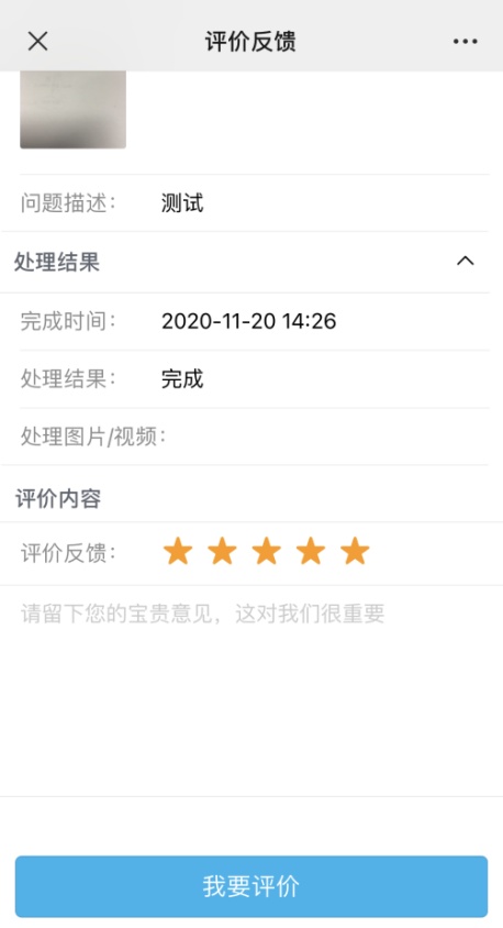 物业将收到的问题处置完毕后,业主可以选择星级,输入反馈意见进行评价打分。如下图: