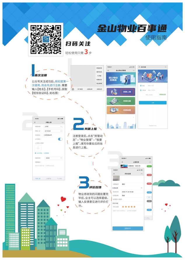 1操作简便、一键报修。小区业主可通过关注“金山房管”微信公众号,无需再另行下载手机软件,简单注册即可实现一键报修。