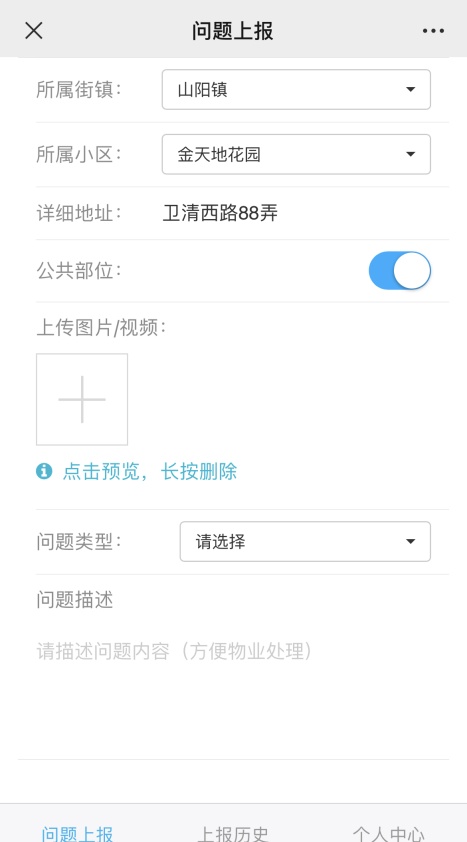 点击“我要上报”后,可以开始信息上报。上报时,上传对应的现场图片,选择问题类型,描述问题内容,然后点击“我要上报”即可完成信息的上报操作。
