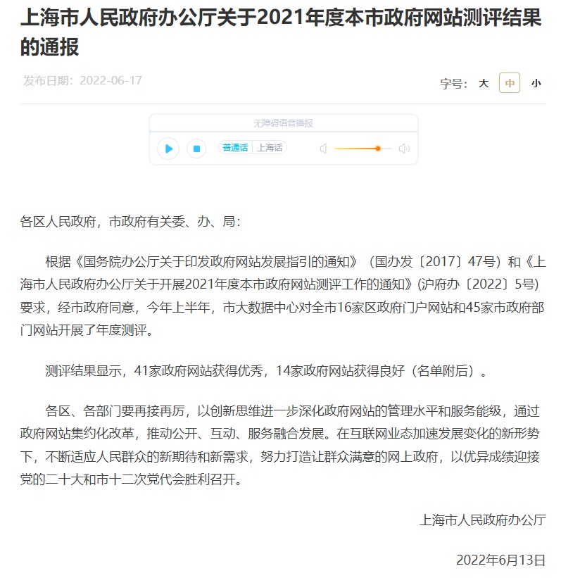 近日,《上海市人民政府办公厅关于2021年度本市政府网站测评结果的通报》发布。测评结果显示,41家政府网站获得优秀,14家政府网站获得良好。其中,青浦区政府门户网站测评结果为优秀!