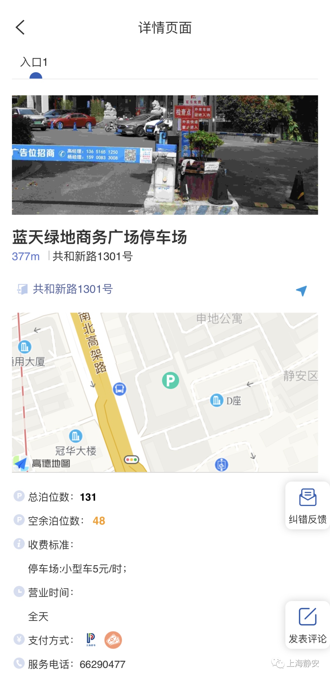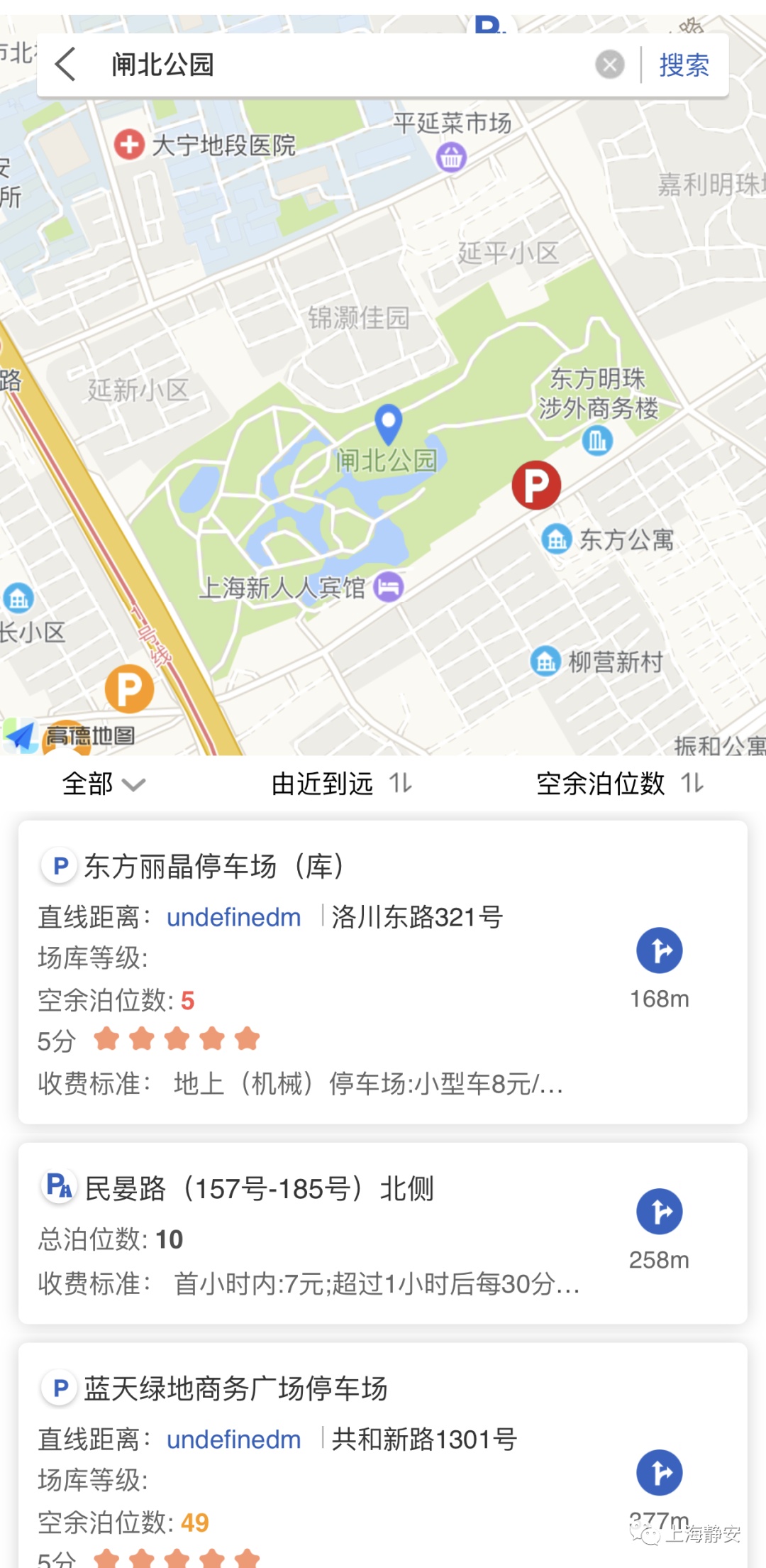 例如搜索闸北公园,页面会跳转出周围的停车场、空余泊位数和收费标准。