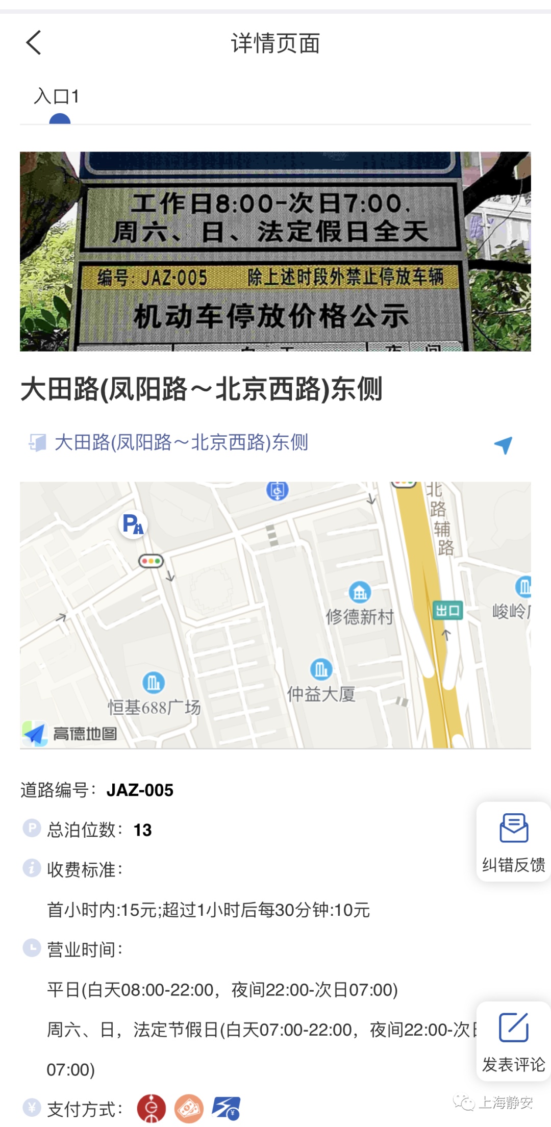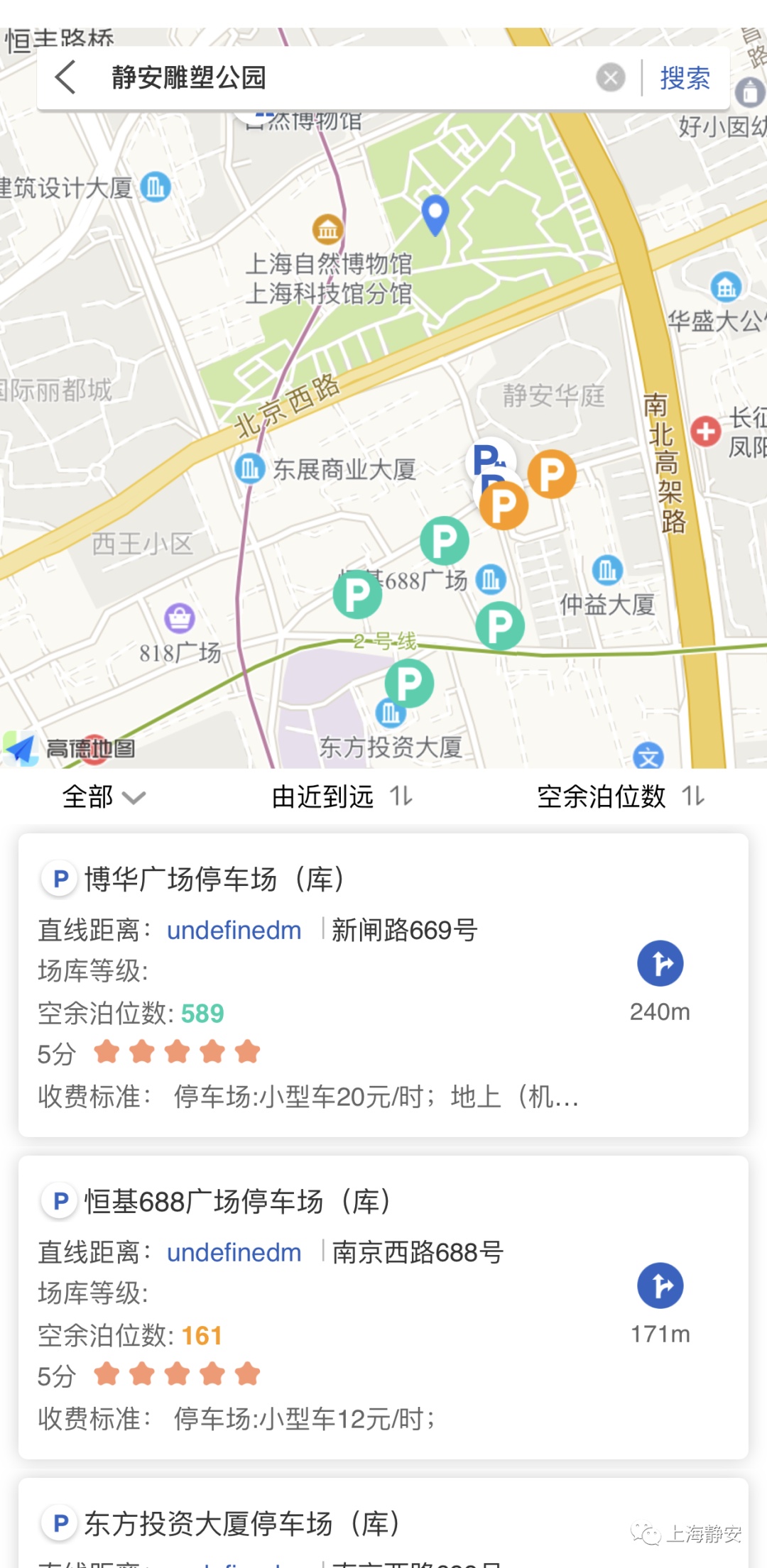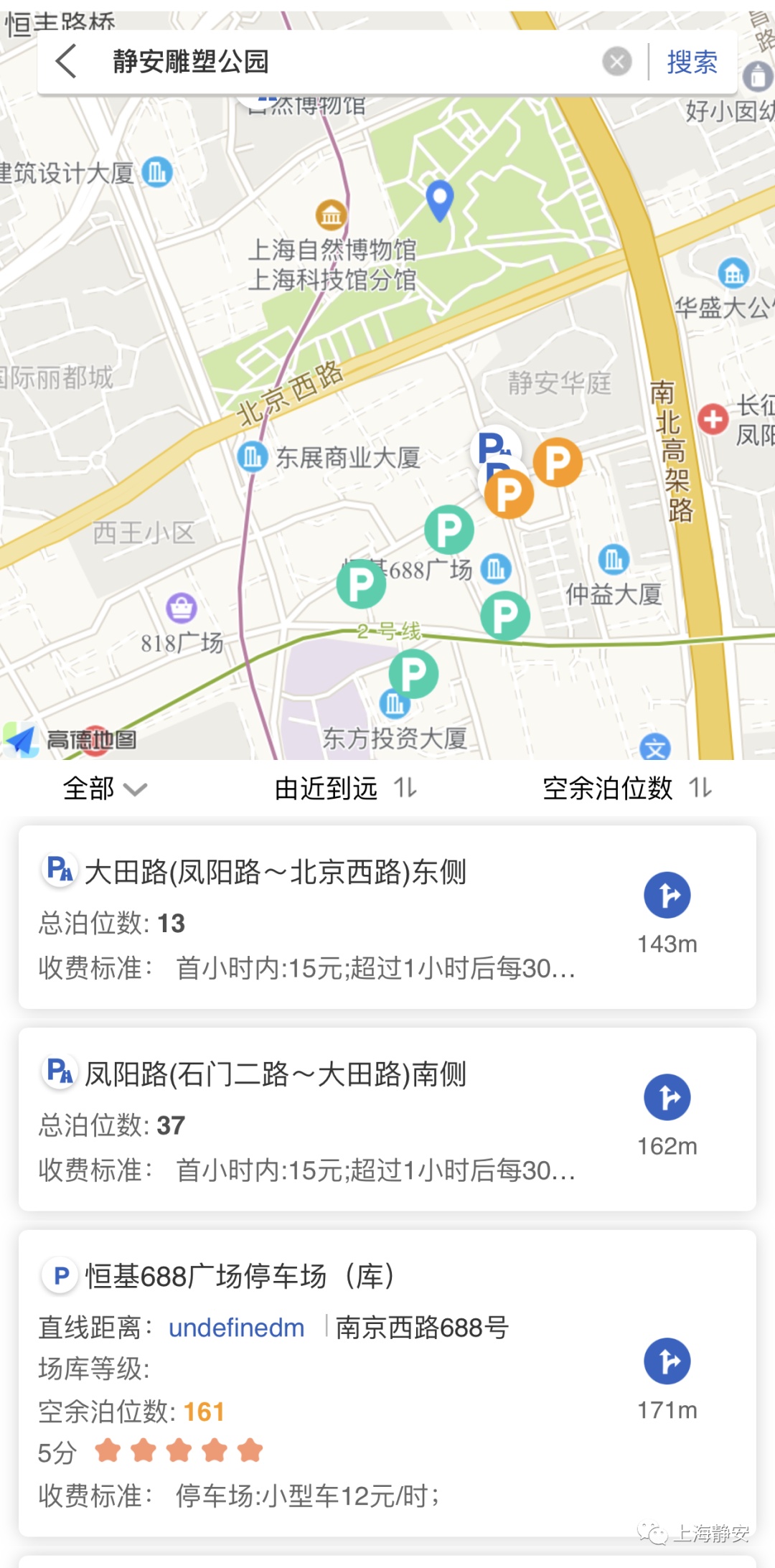 搜索静安雕塑公园,显示出最近的停车场是大田路(凤阳路~北京西路)东侧,收费标准首小时是15元;超过1小时后每30分钟10元。