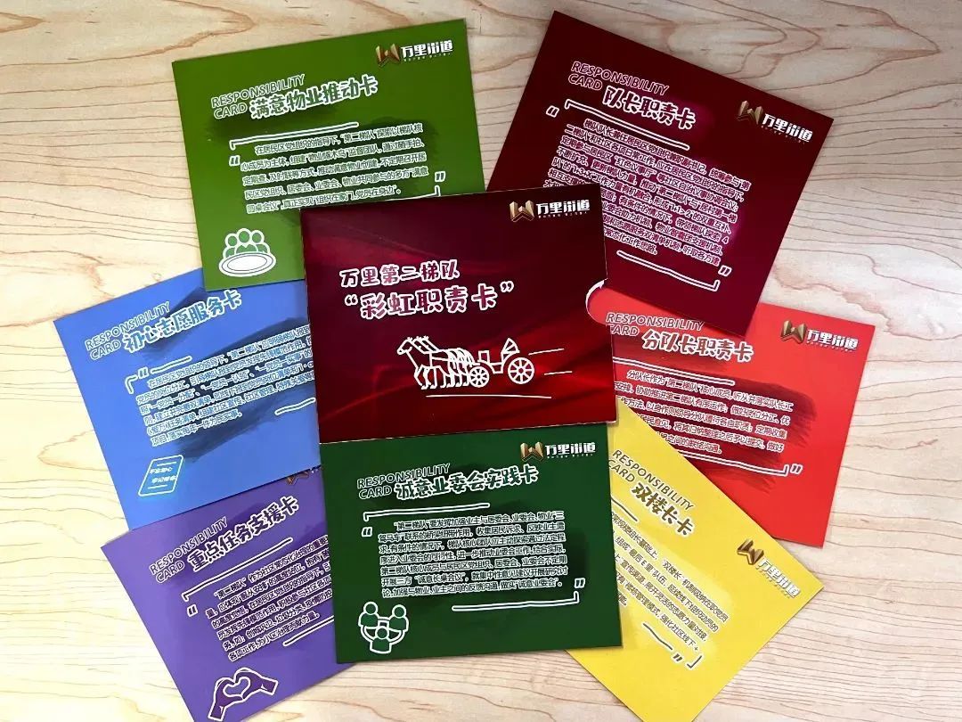 “万里彩虹”职责卡分设红色——“队长职责卡”、橙色——“分队长职责卡”、黄色——“双楼长卡”、绿色——“诚意业委会实践卡”、青色——“满意物业推动卡”、蓝色——“初心志愿服务卡”、紫色——“重点任务支援卡”。
