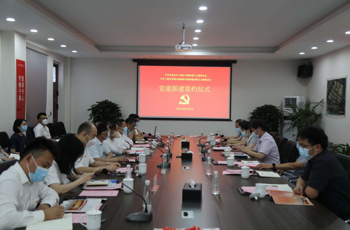 2022年7月7日,中建东孚上海公司崇明项目党支部与上海市崇明区规划和自然资源局机关党支部开展以“喜迎二十大 奋进新征程”为主题的党建联建活动。