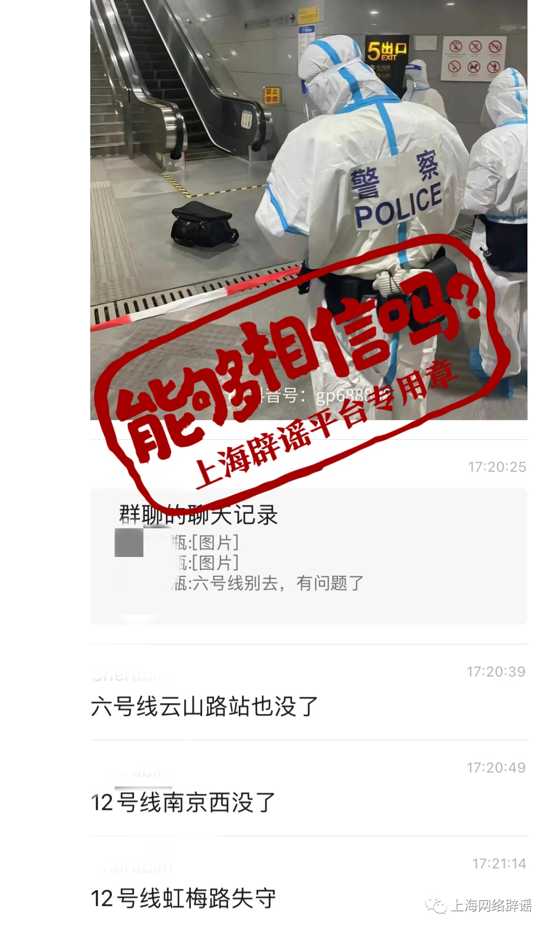 上海辟谣平台核查后还发现,除有市民误将曹杨路站局部消杀当成是“封站”外,上周也有部分车站因为临时进行局部消杀被误以为“封站”,甚至有传言称这些地铁站“失守”、“没了”。
