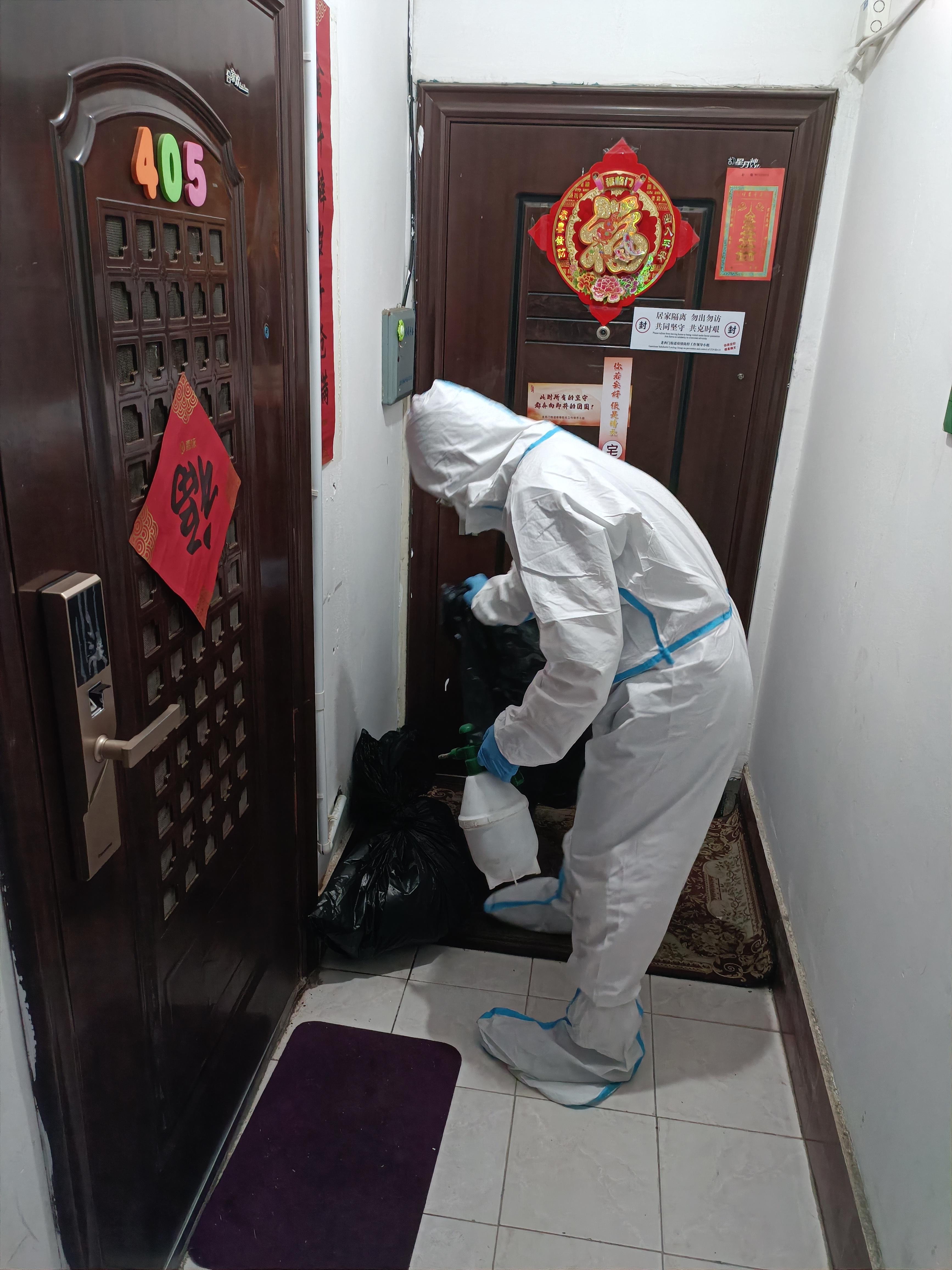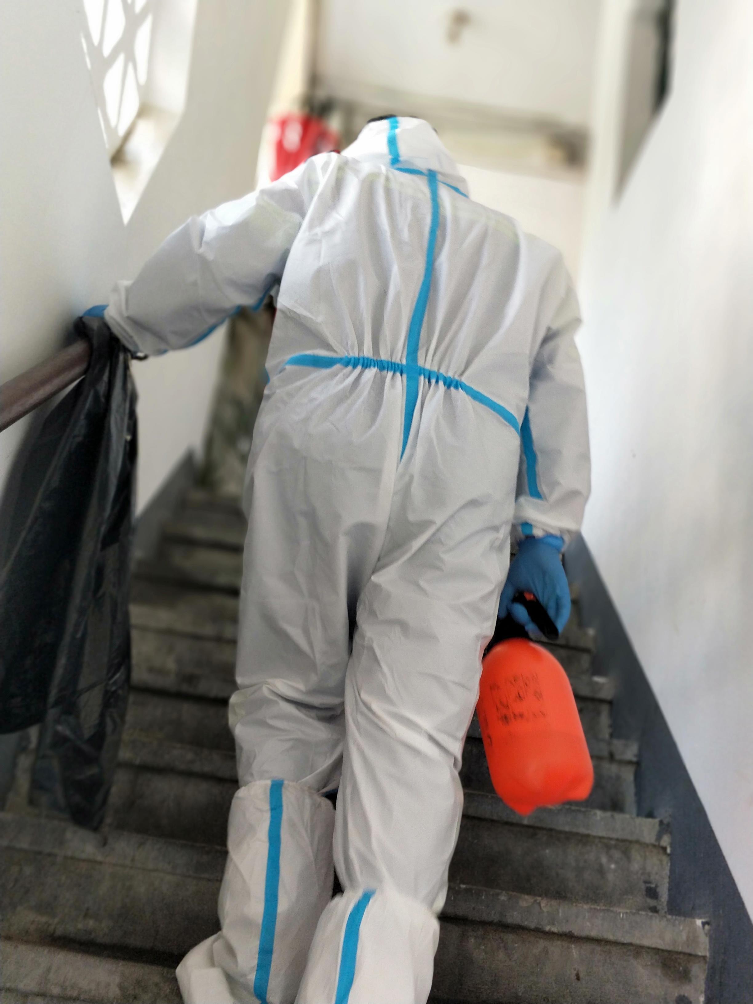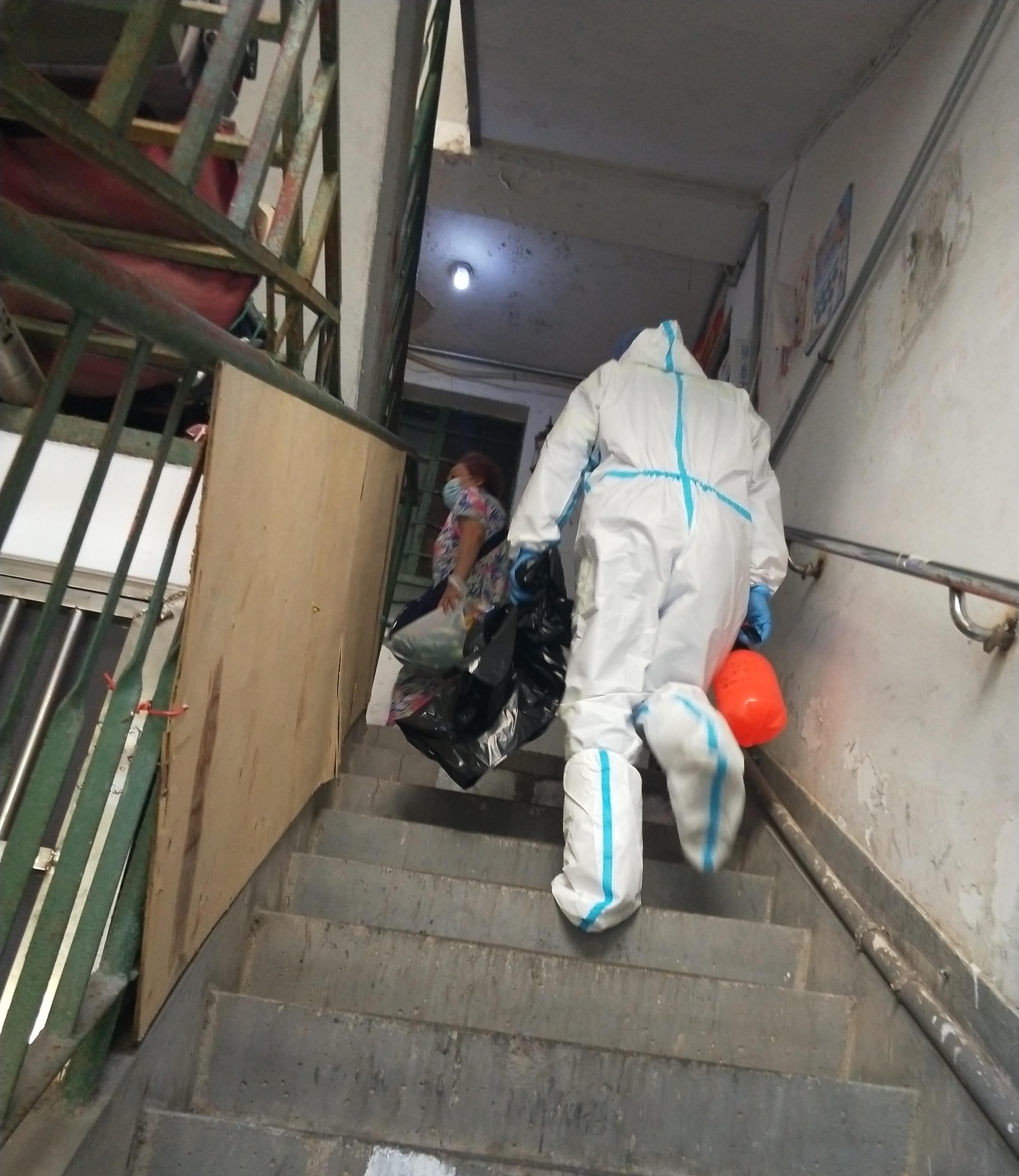 7月13日,一大早,收运小队的伊兴见穿上密不透风的“大白”服装,赶往涉疫小区。由于是老城厢,大多居民楼没有电梯,伊兴见穿戴着闷热的防护装备、手提着消毒桶,一层层爬楼,挨家挨户给隔离居民的生活垃圾扎带、消毒、投放。然后,再对途经的楼道等进行消毒,每一步都严格按照规定进行,这一系列动作,他每天要重复很多遍。“这么热的天气,一天下来,我们拼的就是体力和耐力。”伊兴见告诉记者,这几天,脱下防护服的他,仿佛整个人刚从水中出来一般,非常难受。