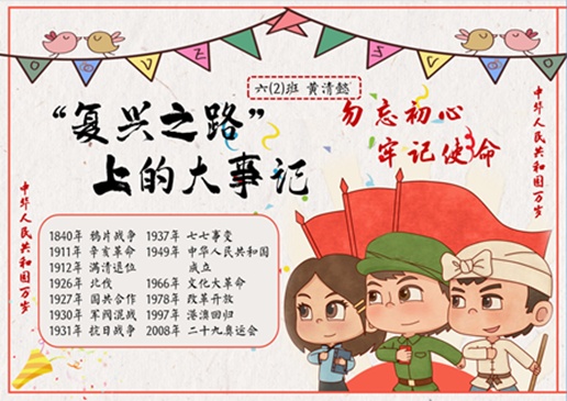 海报上,卢湾中学六年级的同学们有的制作了历史年表,简明扼要地呈现了复兴之路上的历史变迁;有的梳理了发展大事记,准确介绍了产生深远影响的重大事件;还有的同学再现了重要历史场面……