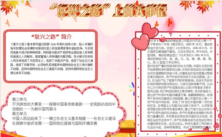 从封建社会的瓦解,到共和国的建立,再到新时代的腾飞,中华民族自立自强的每一步都举步维艰。小小党史宣传员们深入探究复兴路上的每一个阶段,明析发展历程,感悟革命艰辛,绘制宣传海报。