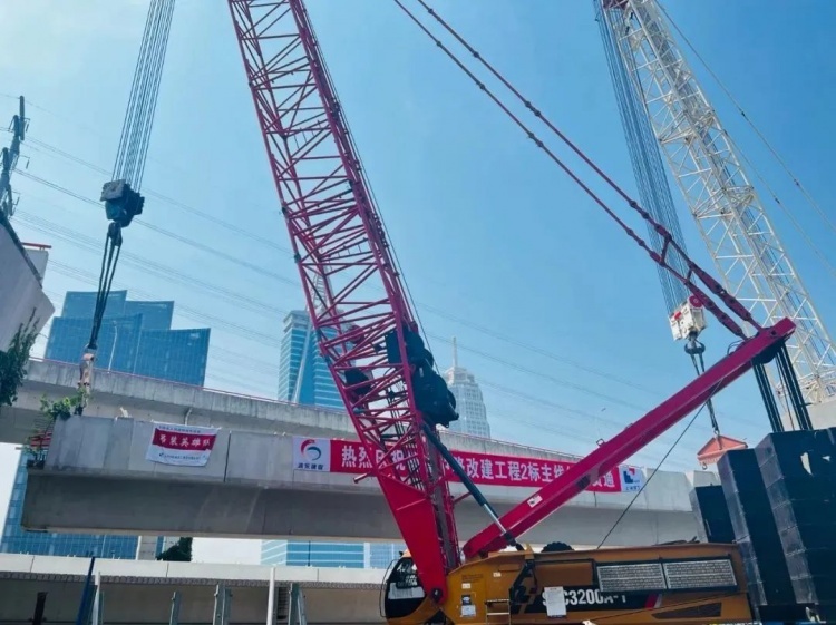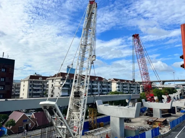 近日,320吨履带吊与450吨履带吊同时起钩,长31米、宽3.2米、高1.8米,重达180吨的小箱梁安装就位,杨高中路(罗山路立交~中环立交)改建工程2标主线结构顺利贯通,进入最后的通车冲刺阶段。