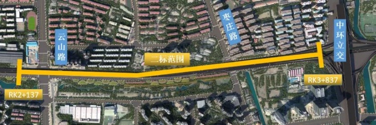杨高中路改建工程2标全长约1.7公里,工程上跨云山路(蓝天路)、枣庄路(红枫路)接入中环立交主线,在枣庄路西侧设置一对上下匝道,东侧对杨高中路跨线桥及中环立交的部分匝道进行拆除改造。