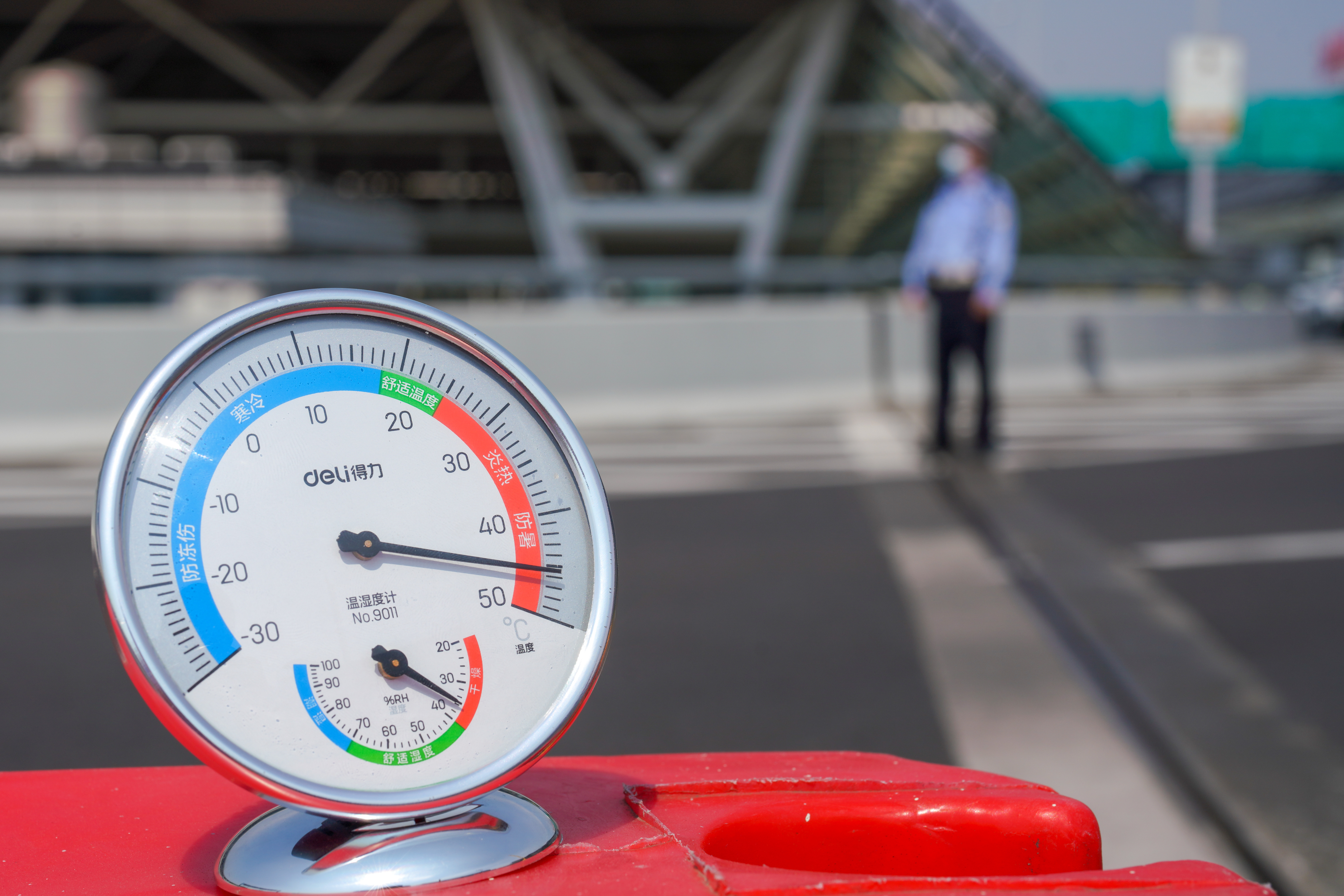 7月14日上午9点半,虽然远没有达到一天气温的峰值,但在毫无遮挡的上海虹桥站南出发层,温度计指针已急切地越过了45摄氏度刻度。密集的送行车流中,上海铁路交警正忙碌地疏导着车辆秩序。