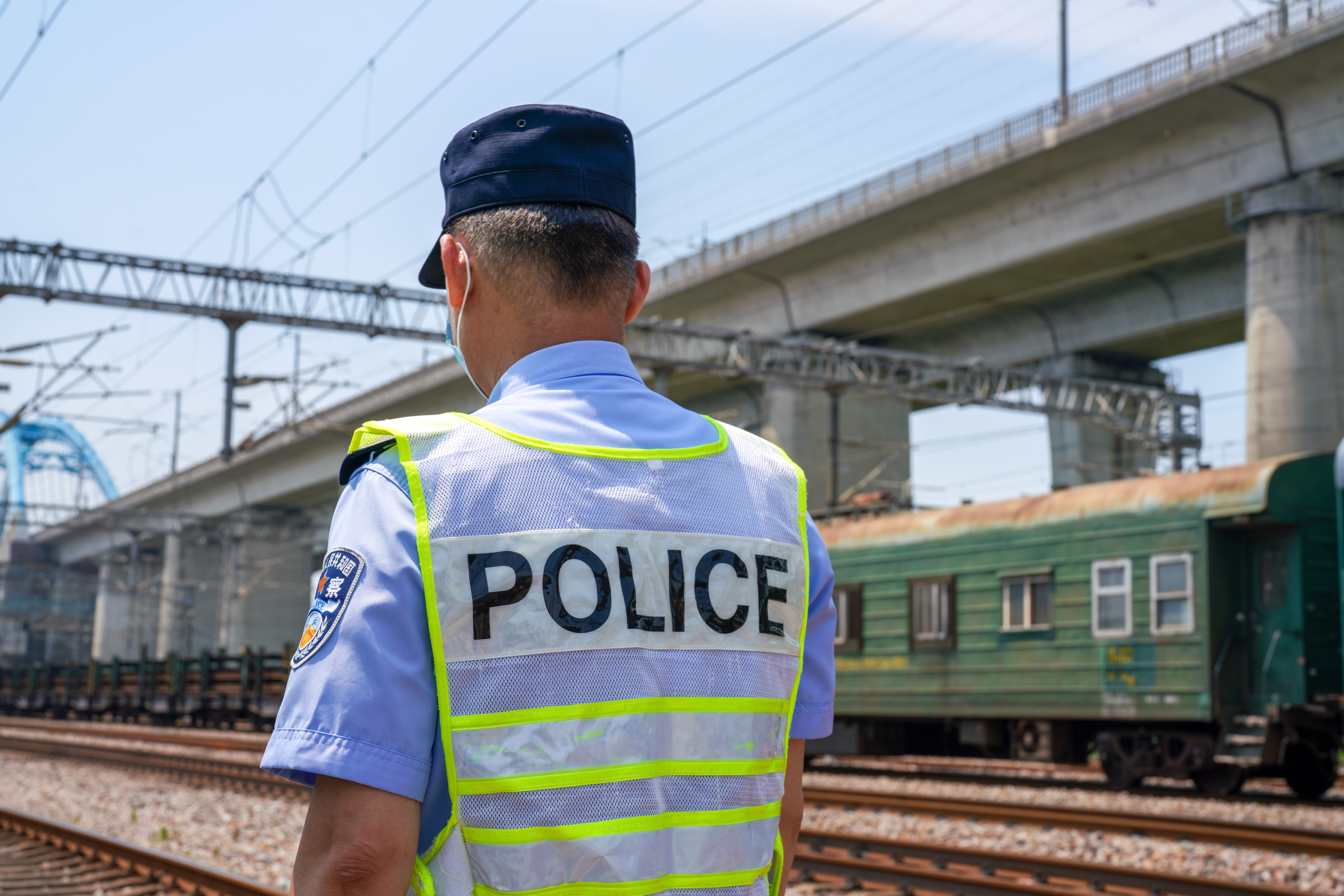 在不为旅客注意的铁轨旁,另一批铁路民警正在烈日下默默地守护着铁路路基的安全。他们的藏蓝警服湿了干、干了又湿。