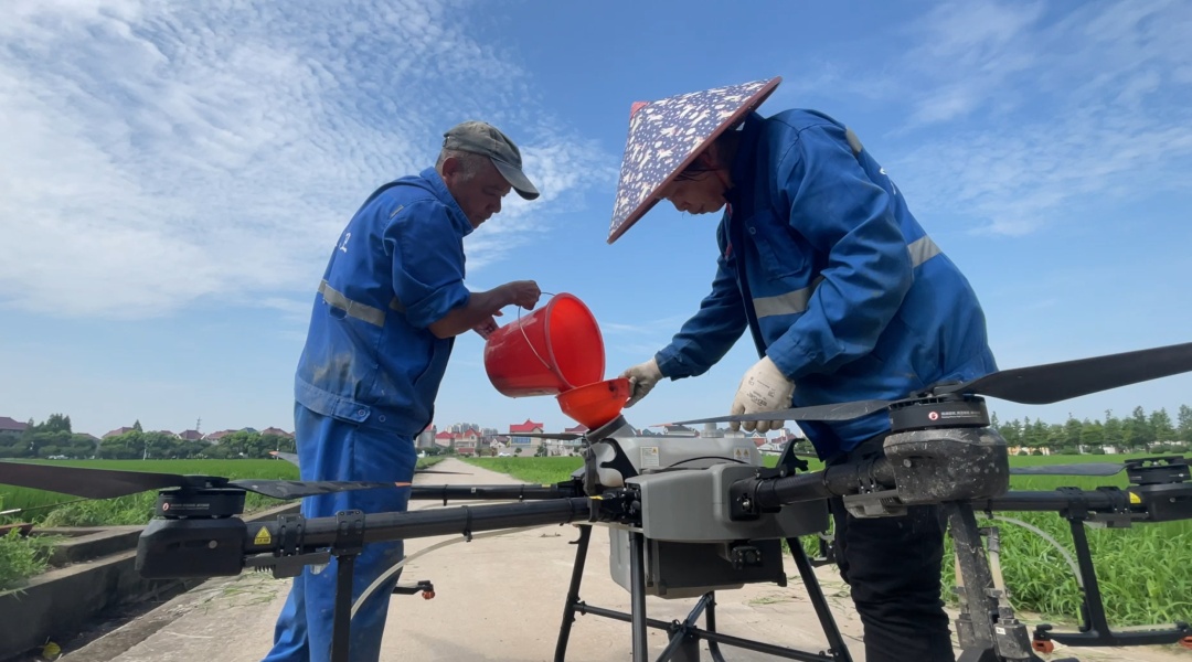 上海同新粮食蔬菜专业合作社植保员告诉记者:“只需两个人加换一下农药,之后无人机就能自动完成喷洒,基本上一个上午,能达到三四百亩。这样的话,可以大大节省人力。”