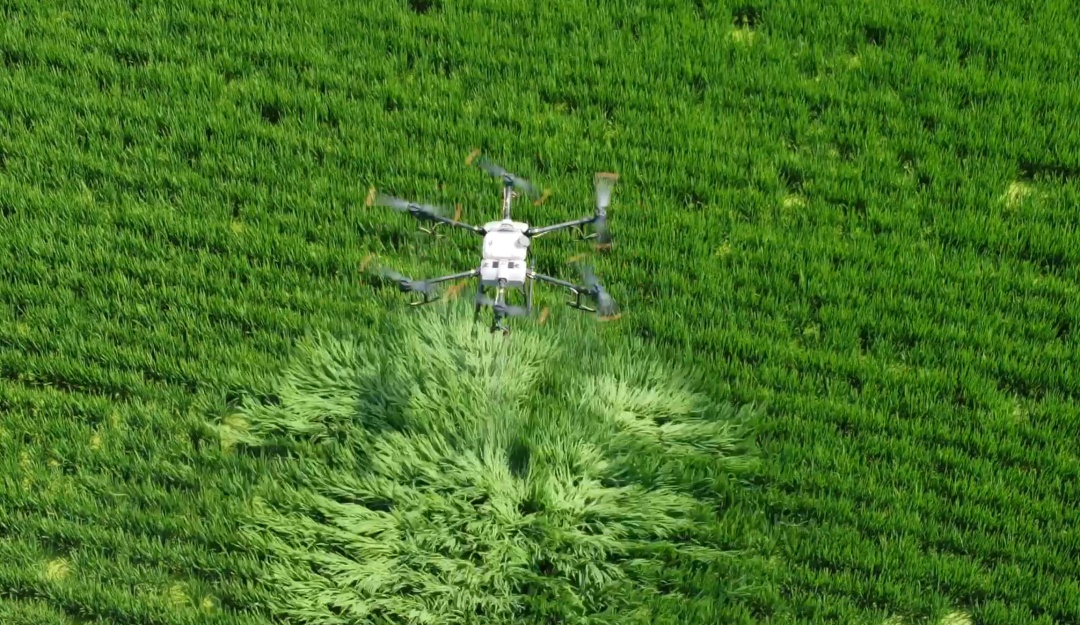 植保机的使用大大提高了工作效率。在工作人员的操控下,植保机匀速飞行在稻田上方,一个上午的时间就完成了整片稻田的喷洒任务。