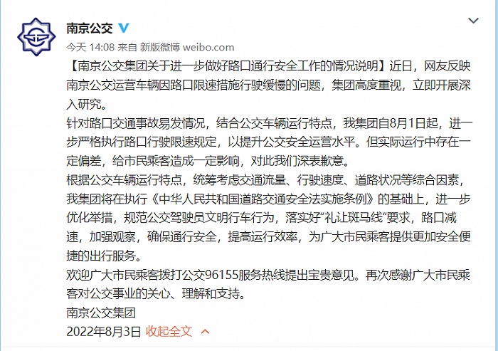 @南京公交微博8月3日就网友反映“公交车降速后还没自行车快”发布情况说明称,近日,网友反映南京公交运营车辆因路口限速措施行驶缓慢的问题,集团高度重视,立即开展深入研究。针对路口交通事故易发情况,结合公交车辆运行特点,公交集团自8月1日起,进一步严格执行路口行驶限速规定,以提升公交安全运营水平。但实际运行中存在一定偏差,给市民乘客造成一定影响,对此深表歉意。