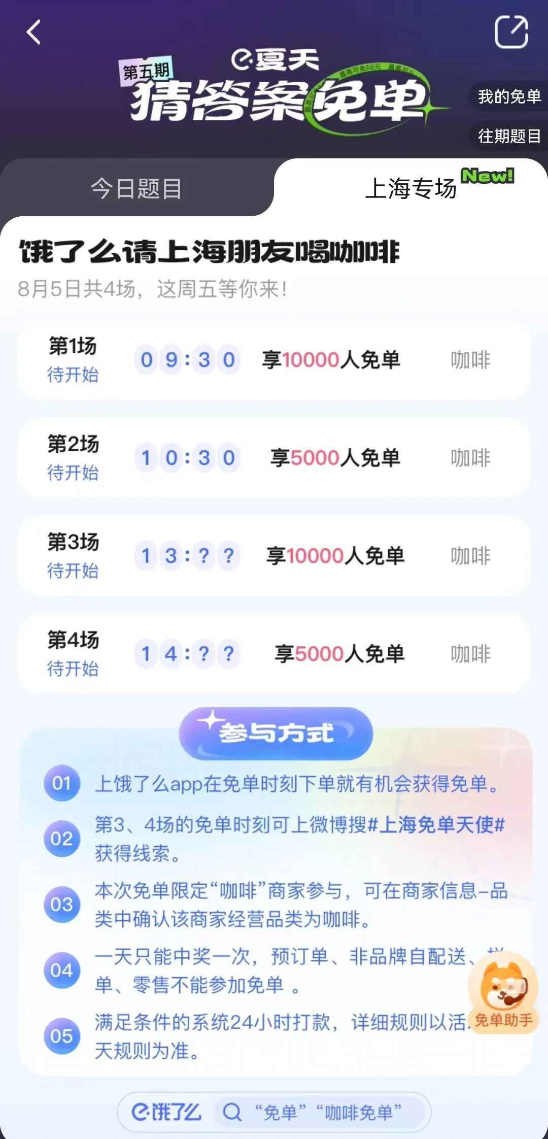 目前,平台已经公布了8月5日免单的四个时间点中的两个,上午9点30分与10点30分。那么另外两个未知的时间点如何获悉?饿了么表示,免单时刻不用猜,寻找“天使”来分享。“免单天使”就是分别在上午9点30分与10点30分获得免单资格的用户,想要获得另外两个时段的线索,只需要上微博搜索#上海免单天使#,通过其分享的信息,就可以获得免单时刻的线索。