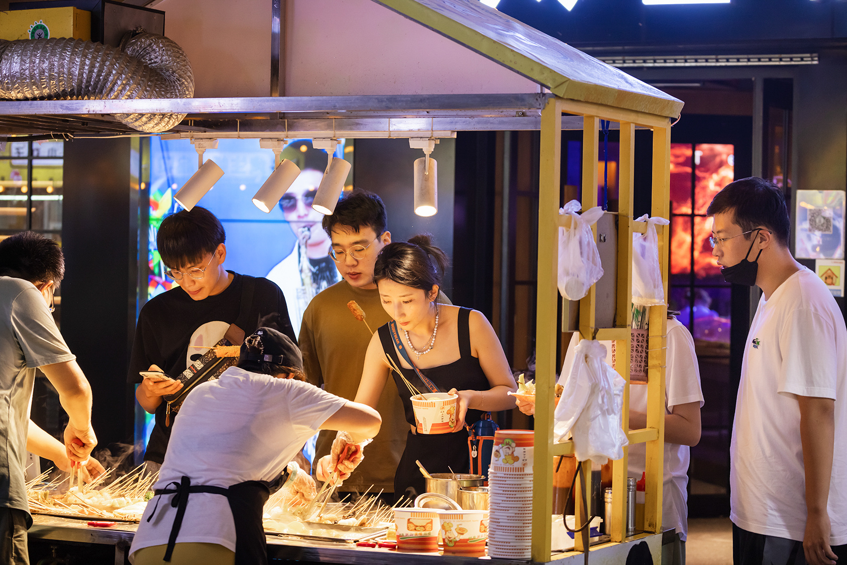 连日来的酷热,档不住人们休闲的脚步,济南洪楼夜市上人来人往,好不热闹。夜市千灯照碧云”,流光溢彩流里小吃摊、小商品摊,摊摊相连,烟火气十足。人们在音乐声、吆喝声、交谈声、欢笑声中品尝着美食,感受济南人不可或缺的夏季夜市情结。(大众日报客户端记者 杨润勤 报道 摄影 张宝贤)