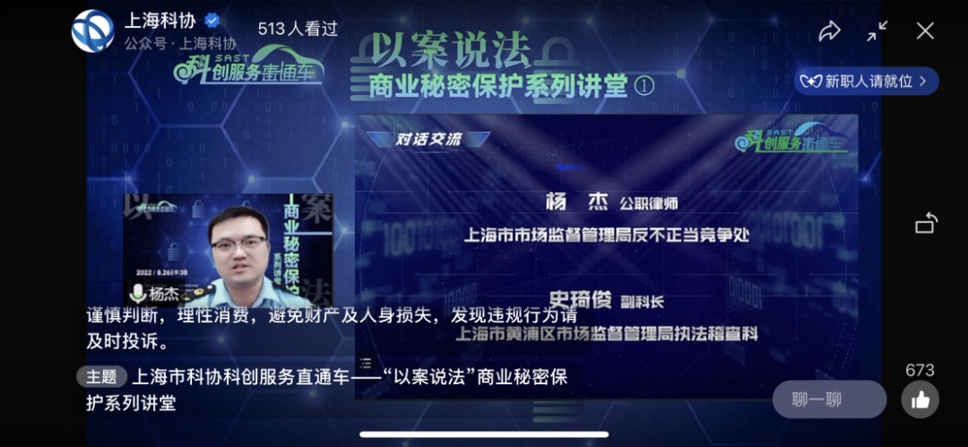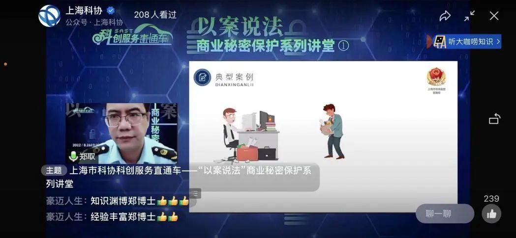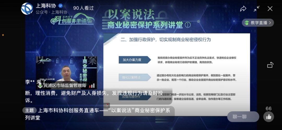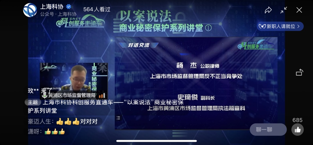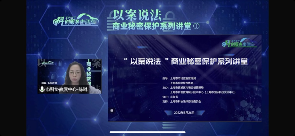 为进一步加强对企业商业秘密保护的指导帮扶,“上海市科协科创服务直通车”于8月26日举办了首场“以案说法”商业秘密保护讲堂。本次活动由上海市市场监督管理局、上海市科学技术协会指导,上海市黄浦区市场监督管理局、上海市科普教育展示技术中心(上海市国际科技交流中心)主办,小红书协办,并得到了上海市科协法律咨询委员会的大力支持。活动通过“上海科协”视频号及官方微博同步直播,当天有超2000人次参与,反响热烈,好评如潮。