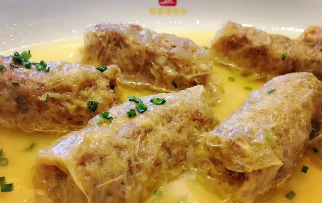 《红楼梦》的第八回里有这么一幕:贾宝玉到宁国府吃饭时,看到有一碟子豆腐皮的包子,想着晴雯爱吃,便和珍大奶奶说了留着晚上吃,叫人送过来。只 是还没等晴雯吃到 ,这碟豆腐皮包子就被李嬷嬷拿回家给她孙子吃了。崇明美食中也有这么一道清蒸豆腐衣包子,晶莹剔透的豆腐衣包裹着丰富的肉馅在蒸笼里不温不火地细数着时光,静享着岁月。