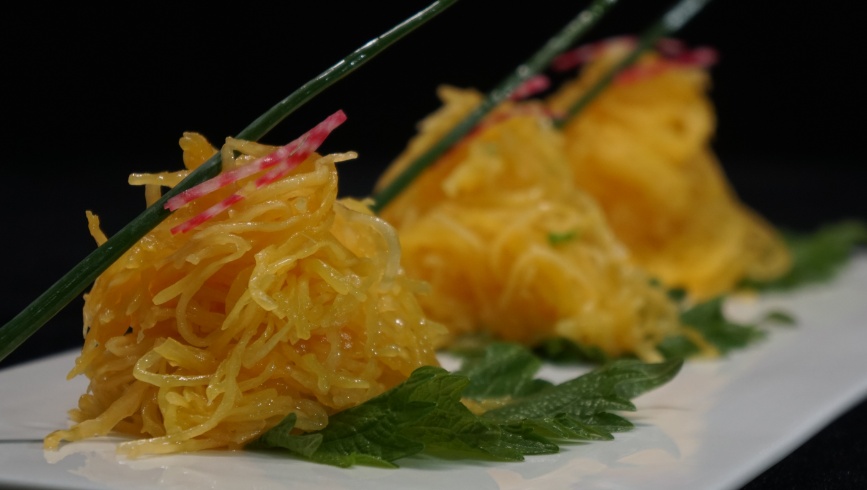 金丝瓜是崇明的特产,也叫金瓜。金瓜的神奇之处在于,它是自然成丝的,金瓜掏去瓜瓤和瓜子后,放入沸水中煮,然后取出放入冷水中冷却,用手搅拌瓜瓣,瓜肉就会自然成为丝状。取出瓜丝,拧干水分,放上盐、葱、味精,浇上热油就成了一道爽口的小菜。