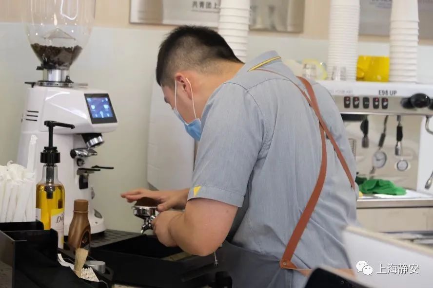 吴佳辰是馆内的首席咖啡师。阳光帅气的他话不多,总爱笑眯眯地看着顾客下单后,转身开始做咖啡。左右晃动拿着拉花杯的手腕,咖啡上晕漾起白色的“之”字型奶泡,奶泡逐渐聚拢,最后形成了一颗爱心图案。做完后,吴佳辰露出稍显稚气的微笑,双手郑重地将咖啡交到顾客手上,并迅速将水台清理干净,整个过程一丝不苟。