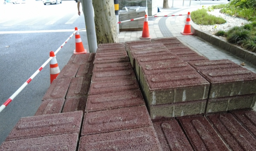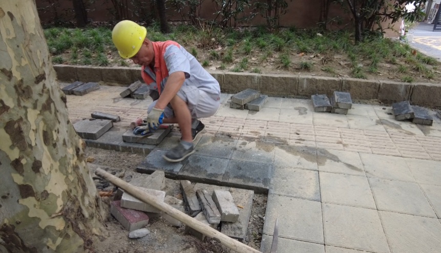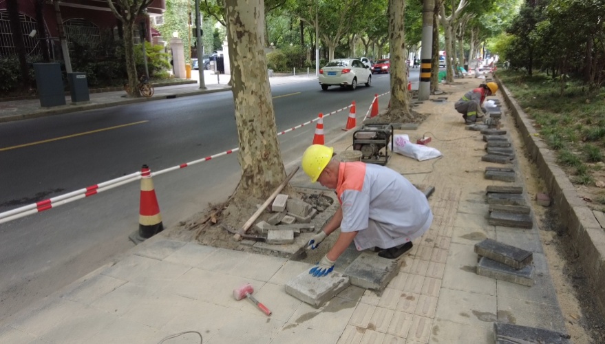 上海普建市政养护有限公司副经理杨肖敏说:“铺地砖看似简单,基底地坪不处理好,地砖不平,很快就会损坏。”枣阳路马路两侧由于树木根系发达,导致周围人行道地面隆起、凹凸不平,市民通行存在安全隐患,也给改造工程的实施带来一定的难度,因此,在铺设地砖前,他们邀请了绿化部门对树根进行修整。该人行道改用透水型钢渣板砖,以废弃钢渣为原材料废物利用,具有强透水性,可减轻排水压力,也能防止行人走路时被水溅湿,砖块表面呈微小凹凸,摩擦力大,防止路面反光的同时还能吸收部分噪音。