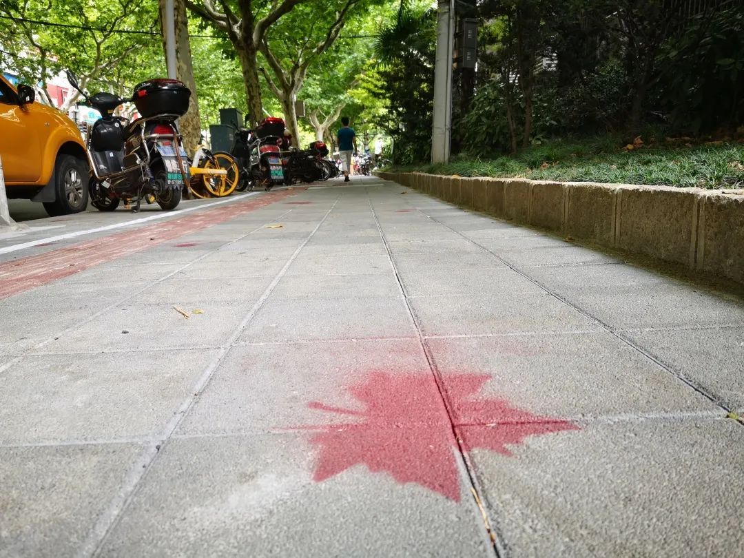 交通管理部门还联合街道结合沿线文化特色、建筑风貌等,对人行道进行美化,为了将脚踩落叶的浪漫永久定格在枣阳路,管理人员费了不少心思。不同于以往单调的砖块,此次改造的人行道砖块上多了许多梧桐树叶,它们可不是从树上飘落下来的,而是由养护人员用喷绘绘制在人行道上的。