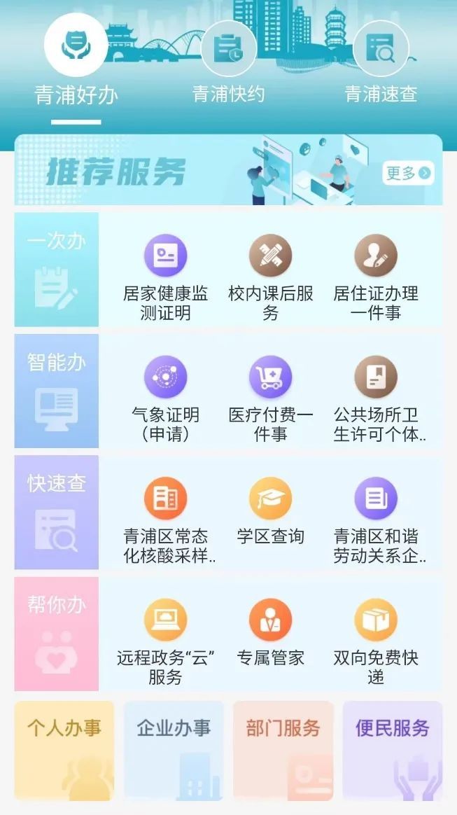 新增的“青浦好办”区域是此次改版的一大亮点,汇聚了广大市民访问最多,使用最频繁的应用。点击进入“青浦好办”区域,最先进入眼帘的是“三办一查”,根据功能服务,划分为“一次办”“智能办”“快速查”“帮你办”四大类,实现办事查询两不误。校内课后服务、公共场所卫生许可个体延续、青浦区常态化核酸采样点查询、专属管家等常用服务都可以在这里“一键触达”~