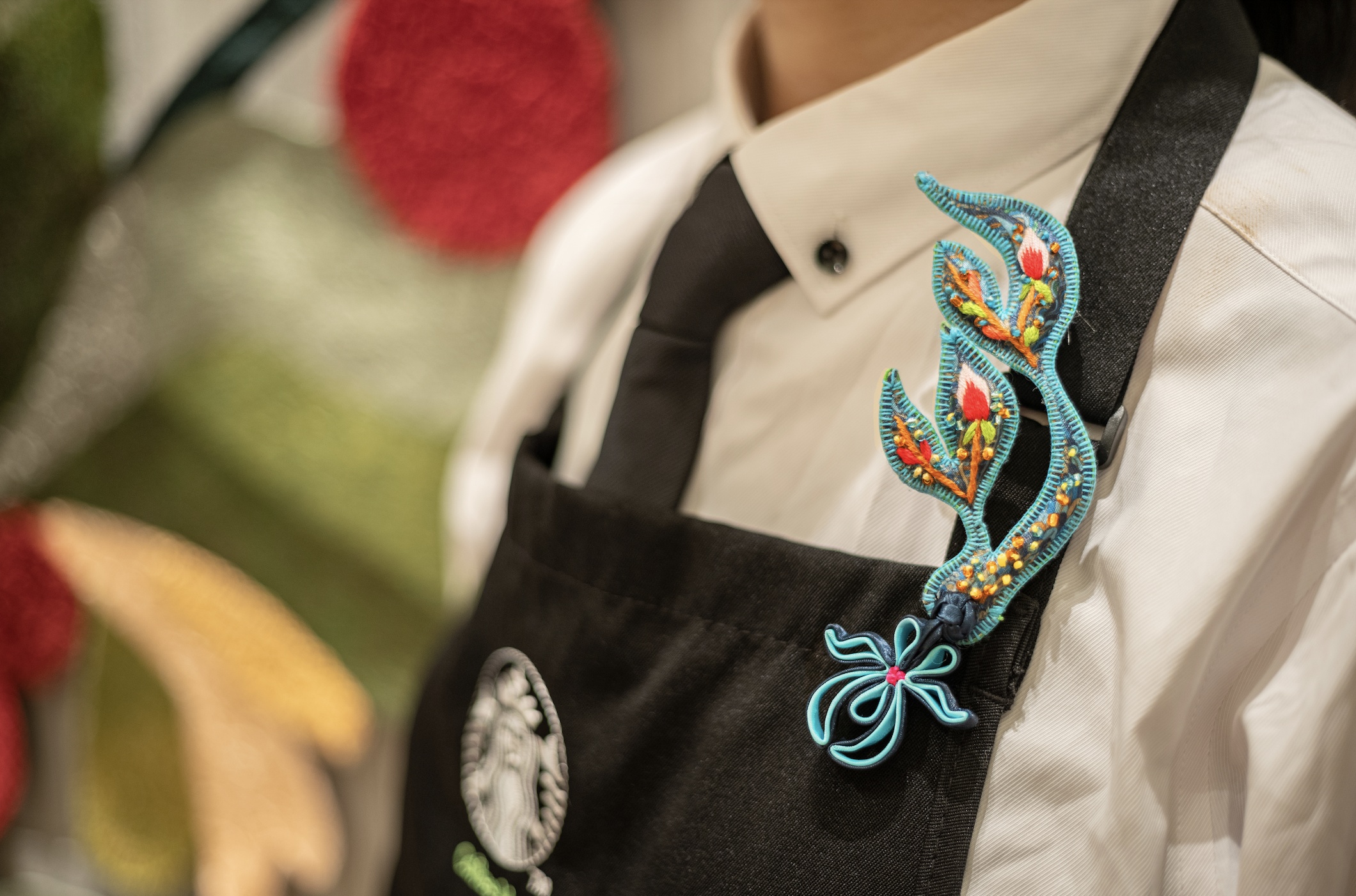 星巴克将非遗之美融入门店第三空间,令顾客在享受高品质咖啡的同时,领略中国文化瑰宝的魅力。譬如,店内拥有一整面传统刺绣工艺制作的咖啡豆花图案背景墙,门店员工佩戴的手工盘扣胸针同时结合了星巴克经典双鱼尾造型与海派旗袍元素,以及在此基础上融合了旗袍领轮廓元素与云南非遗银器打造的星巴克臻选logo、由云南红河非遗锡器手工打造的门把手等。