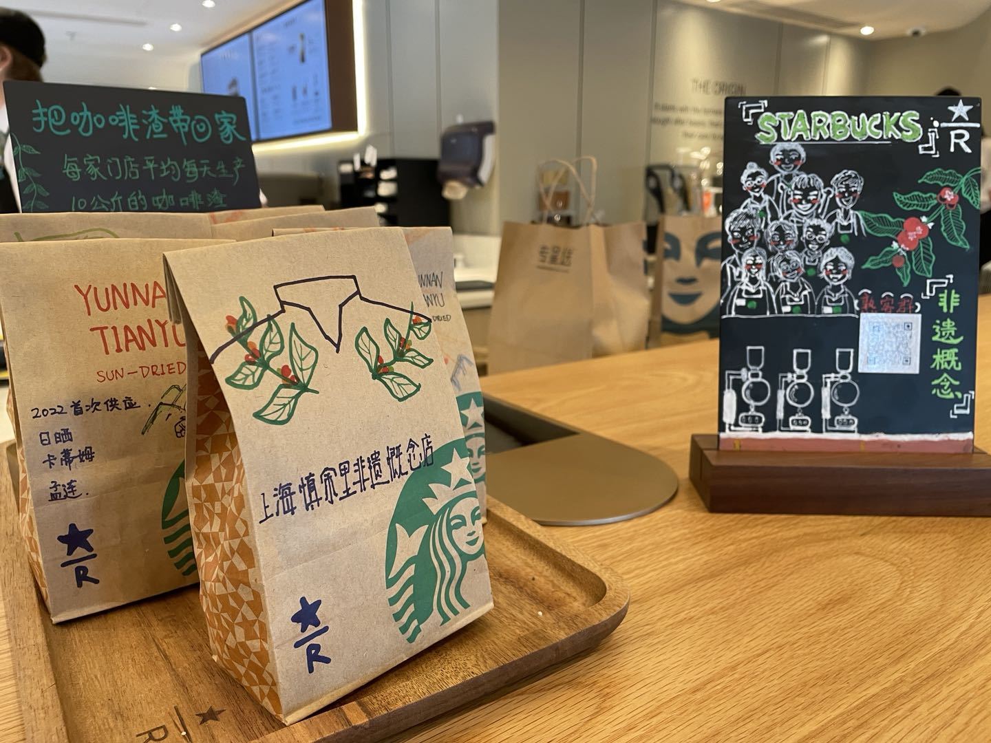 据星巴克臻选慎余里非遗概念店经理陆诗岚介绍,首家非遗概念店还上新了臻选云南咖啡豆,来自云南天宇农场的一款日晒和一款水洗,消费者还可以现场感受上海传统的虹吸咖啡煮法。