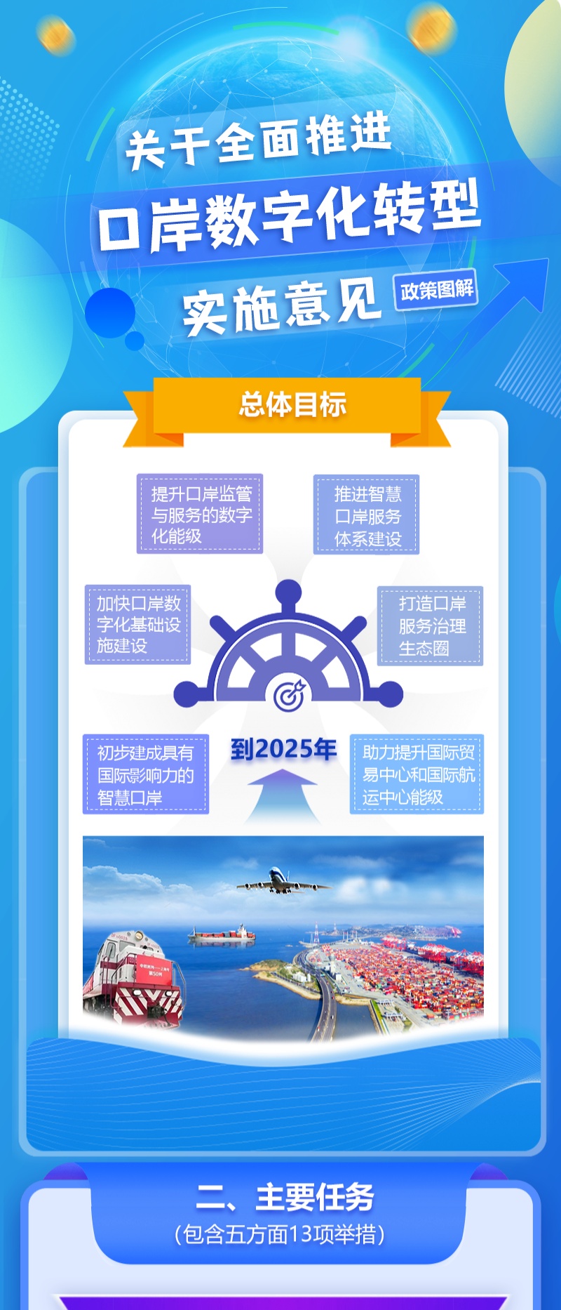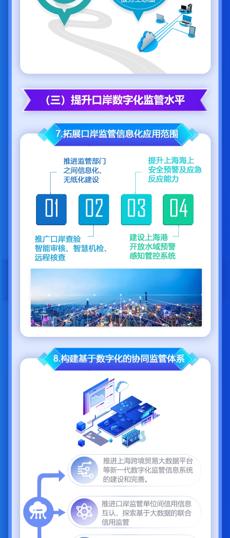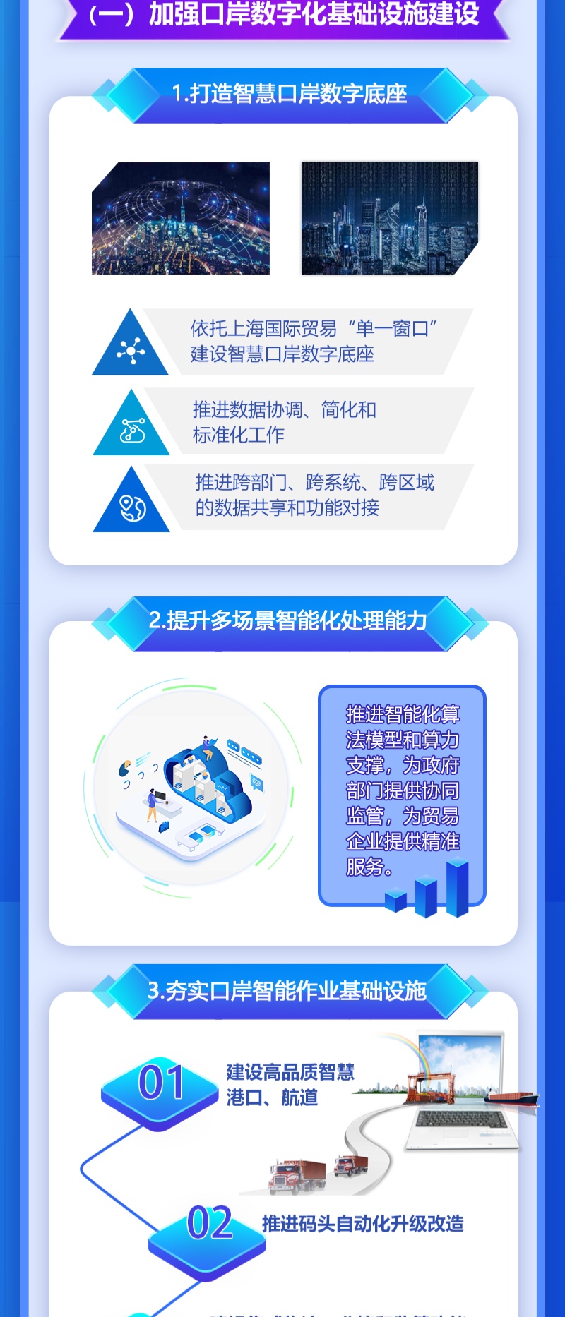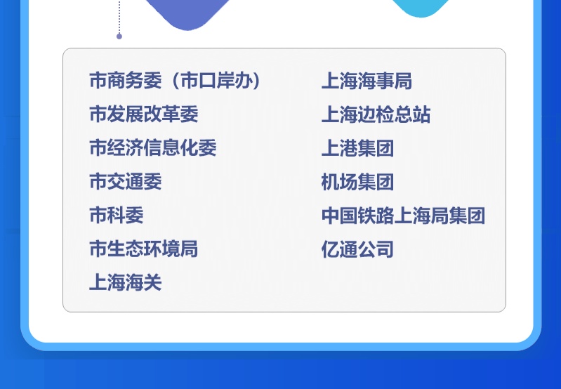 近日,为全面推进本市智慧口岸建设,根据市委、市政府《关于全面推进上海城市数字化转型的意见》、《推进上海经济数宇化转型 赋能高质量发展行动方案(2021-2023年)》和《全面推进上海数字商务高质量发展实施意见》等要求,把数字化转型作为上海口岸"十四五”发展主攻方向之一,更好助力上海加快打造成为国内大循环的中心节点和国内国际双循环的战略链接,上海市商务委员会等九部门联合印发《关于全面推进口岸数字化转型实施意见》,详见