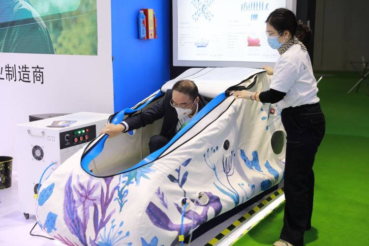 记者在现场看到,参展的四款高压氧舱分为便携式氧舱和硬体氧舱两种,根据不同的造型,人们可以选择坐着或躺着进行补氧。“我们希望通过进博会这个展示窗口,能够吸引到一批国内代理商,同时让消费者对产品有新的认识。”宝邦医疗销售总监许允说。