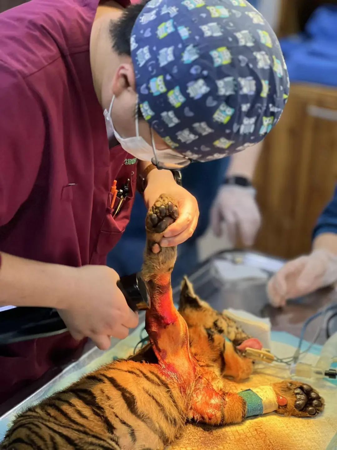 抵达闵行动物诊疗机构后,兽医给小华南虎作了详细检查,虽然只有三个月,但小华南虎的骨头已经很大很粗了,可骨皮质又特别薄、特别嫩,手术需要格外小心。医生也是第一次给濒危动物做手术,好在最终顺利完成了虎“宝宝”右侧肱骨固定手术。据了解,此次治疗全程免费,该诊疗机构负责人表示希望对野生动物的保护做出一份贡献!
