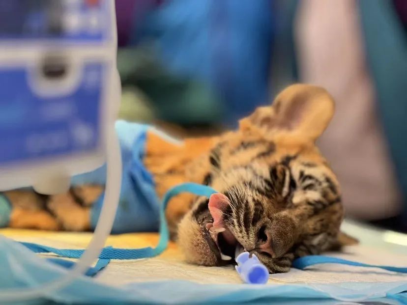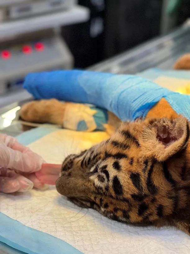 ➤ 小华南虎年仅三个月,和虎妈妈一起生活在动物园。饲养人员在日常照料中观察到其右侧前肢不敢着地,走起路来一瘸一拐,发现虎宝宝受伤了。辗转联系到闵行这家动物诊疗机构,经医生初步诊断为右侧肱骨骨折,急需进行右侧肱骨固定手术。