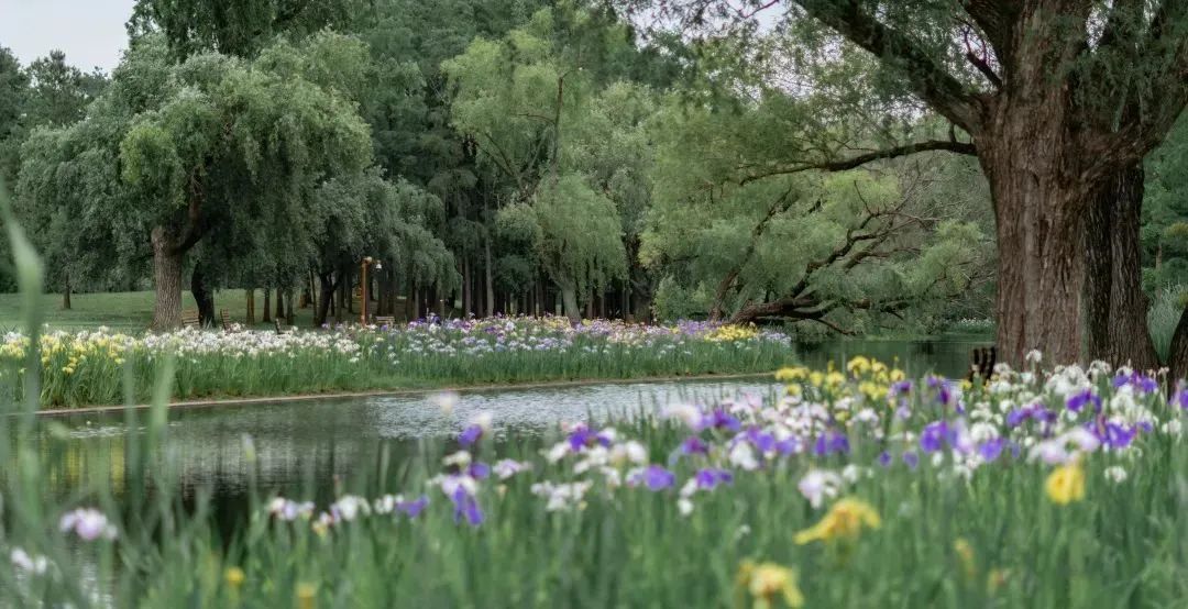 依托共青森林公园原有水景特色,在华明桥东侧及园内几处河岸景观节点等区域种植了约3000平米、近50个鸢尾品种,囊括蓝、白、紫、粉、黄等不同色系,为市民游客打造了初夏时节赏花赏水景的特色景观空间。在五彩斑斓、层次丰富的花菖蒲花海景观中,一条蜿蜒纵深的游赏汀步使得游客可以零距离亲水赏景。最佳观赏期为4月中旬至6月中旬。