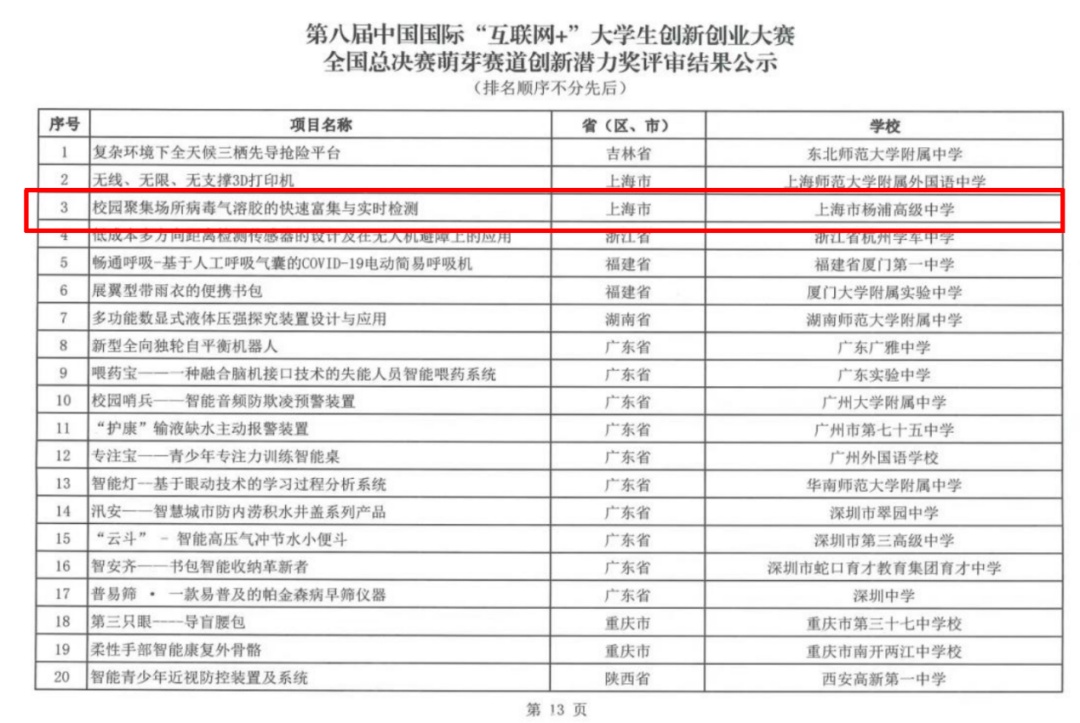 近日,第八届中国国际“互联网+”大学生创新创业大赛落下帷幕,杨浦高级中学的项目《校园聚集场所的病毒气溶胶快速富集与检测》荣获国赛萌芽赛道的最高奖——创新潜力奖。这也是继上一届上海理工大学附属中学之后,杨浦高中学子第二次摘得该项荣誉。