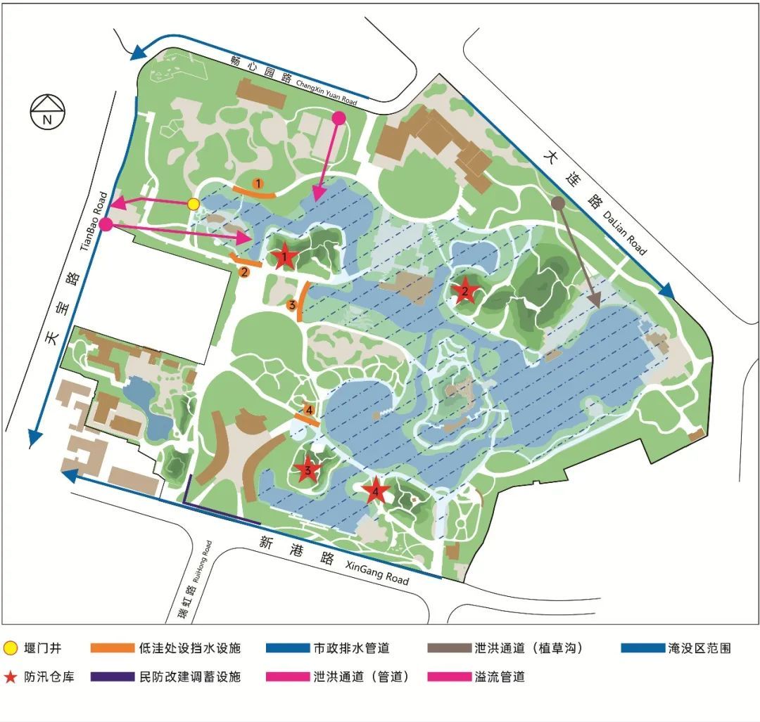 同时,试点探索民防设施雨水调蓄改造利用,对公园内退序民防设施进行加固和防水改造,作为调蓄管使用,与湖体相连通,为湖体调蓄进行补充。利用园内废弃弹药库作为防汛设施储藏间。
