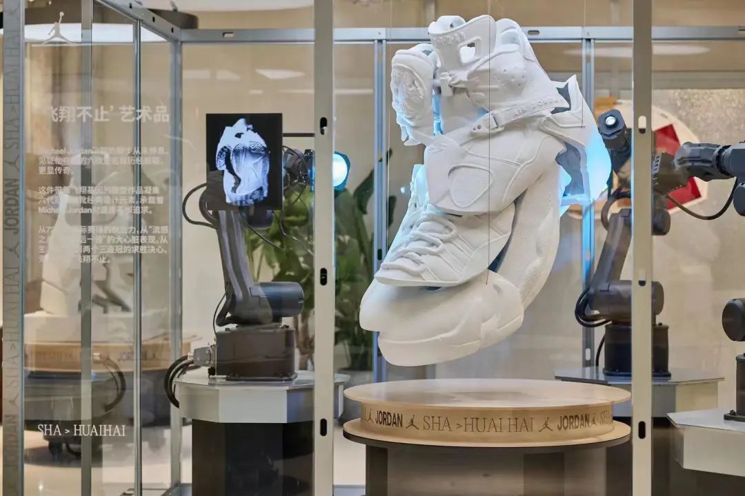 在一层空间中心处的艺术装置,是以迈克尔·乔丹六代冠军战靴为设计灵感的雕塑作品,并对鞋体加以解构改造,融入不同元素混搭,彰显出品牌主场由篮球场延伸至艺术、潮流、街舞、音乐等更广泛文化范畴的迭代进化。