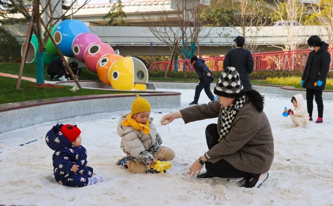 有一对身着红衣的夫妇边走边拍照,他们告诉记者,自己在田林住了十几年了,这里原先的绿地比较单调。“这次真是大变样,太好了。这里附近小朋友可以玩的地方比较少,现在多出了那么大一块区域,场地也好,配套也好,孩子开心我们大人也开心。”有的游客并不住在周边,刚好逛完宜家出来就发现了这个小游园。“简直就是宝藏,两个孩子在这里都不肯走了。”