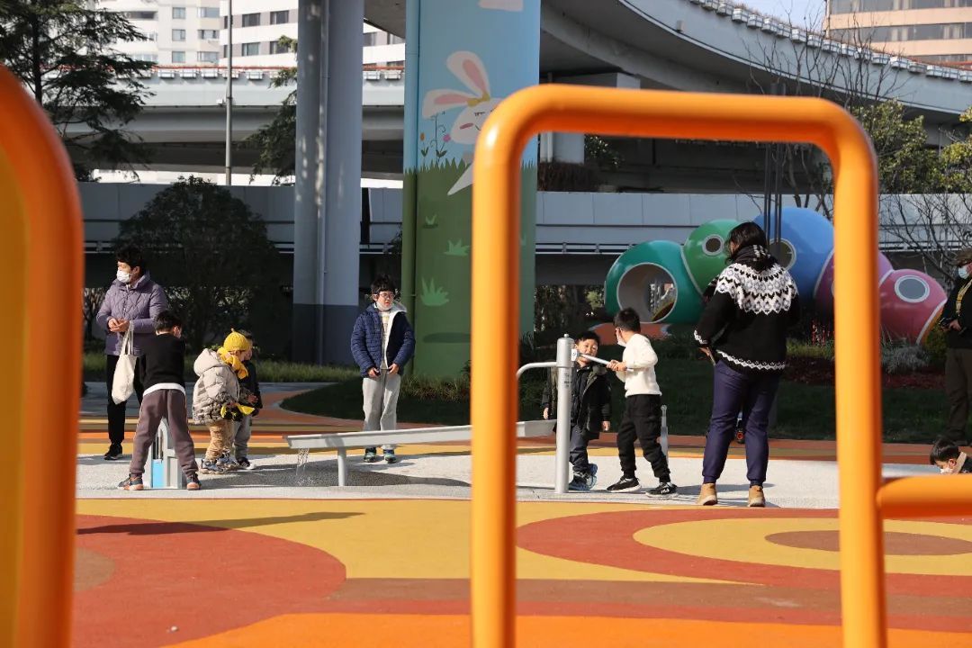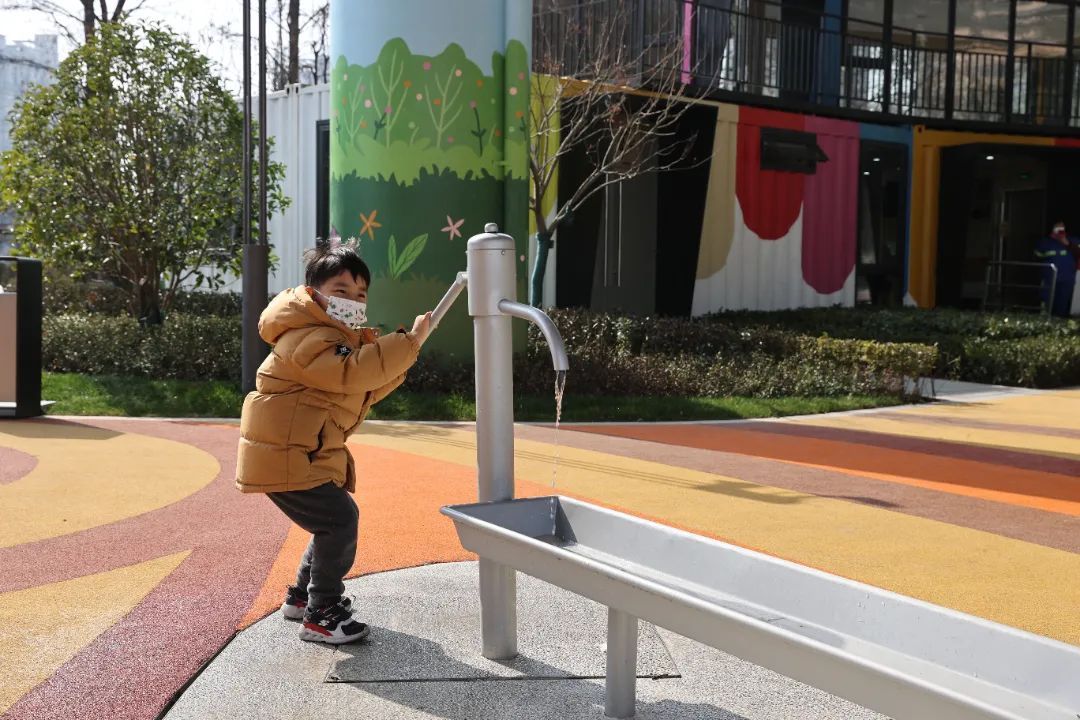 场地的设计立足儿童友好,在活动区域铺设柔软的橡胶颗粒,为孩子们意外跌倒提供了保护。一旁的洗手池也被打造成了卡通的造型,还贴心地设置了两个高度。集装箱改造而成的亲子驿站布置有母婴室、无障碍卫生间等,今后还将嵌入售卖、寄存、社区服务等功能,更增强了人性关怀与舒适体验。经过精心更新改造后的乐汇小游园多元、包容、富有亲和力,让前来游玩的市民纷纷点赞。