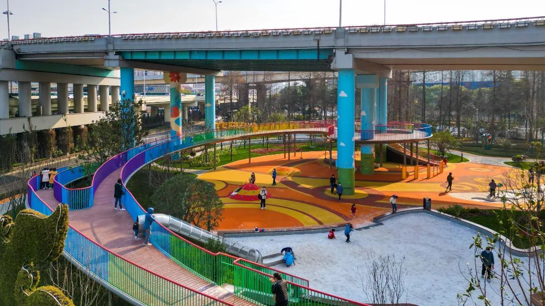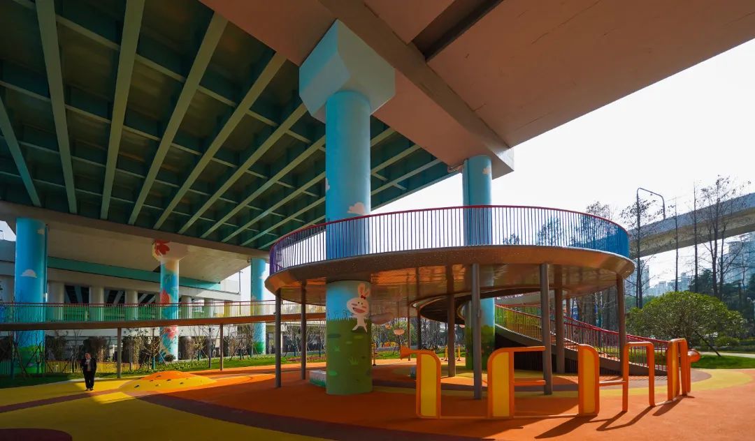 踏入小游园,旋转而上的彩虹桥最是吸睛。“桥下之桥”的设计通过延伸,将园内最受孩子们欢迎的探趣乐园分为了上下两层,塑造了立体的游园空间。在场地中心区围绕高架柱点设置的旋转楼梯则连接了这两层空间,大大增加了乐园的探索乐趣。