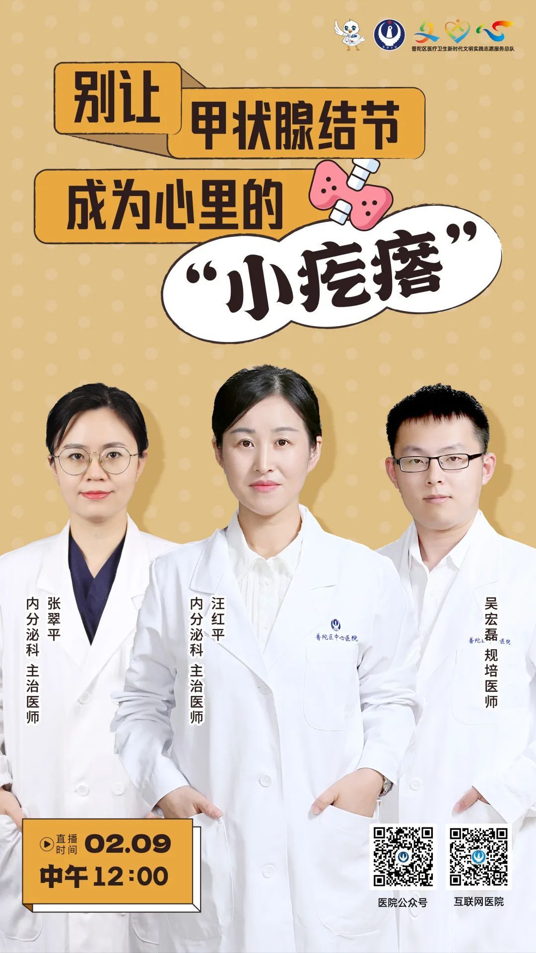 2月9日(周四)12:00,普陀区中心医院5g健康直播间将以《别让甲状腺结节,成为你心里的小疙瘩》为主题,由内分泌科主治医师汪红平、张翠平、规培医师吴宏磊一起搭档,来解读甲状腺结节这个“小疙瘩”,改变错误认知,维护健康生活方式,保护好我们的甲状腺。观众朋友们,让我们不见不散~