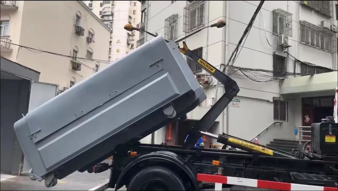 据了解,现在小区里所有的装修建筑垃圾都会打包后放入这个“箱子”里,到了清运时间,只需使用一辆拉臂车,完成箱体的更换工作即可。整个过程仅花费几分钟,密封式管理确保垃圾不落地,并且铲车不再参与清运,噪音、扬尘污染也随之消失。