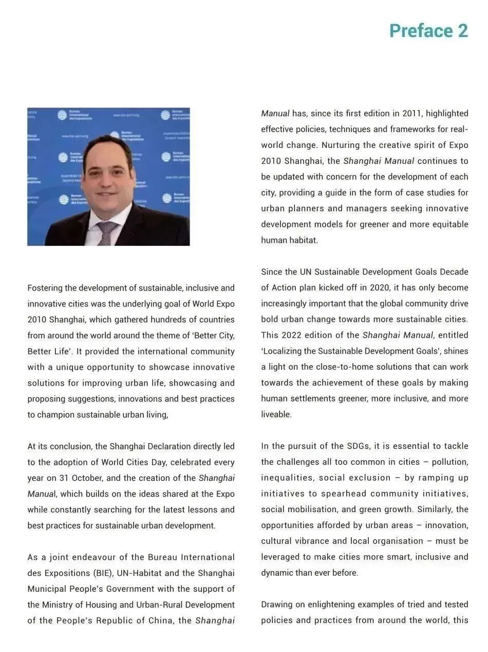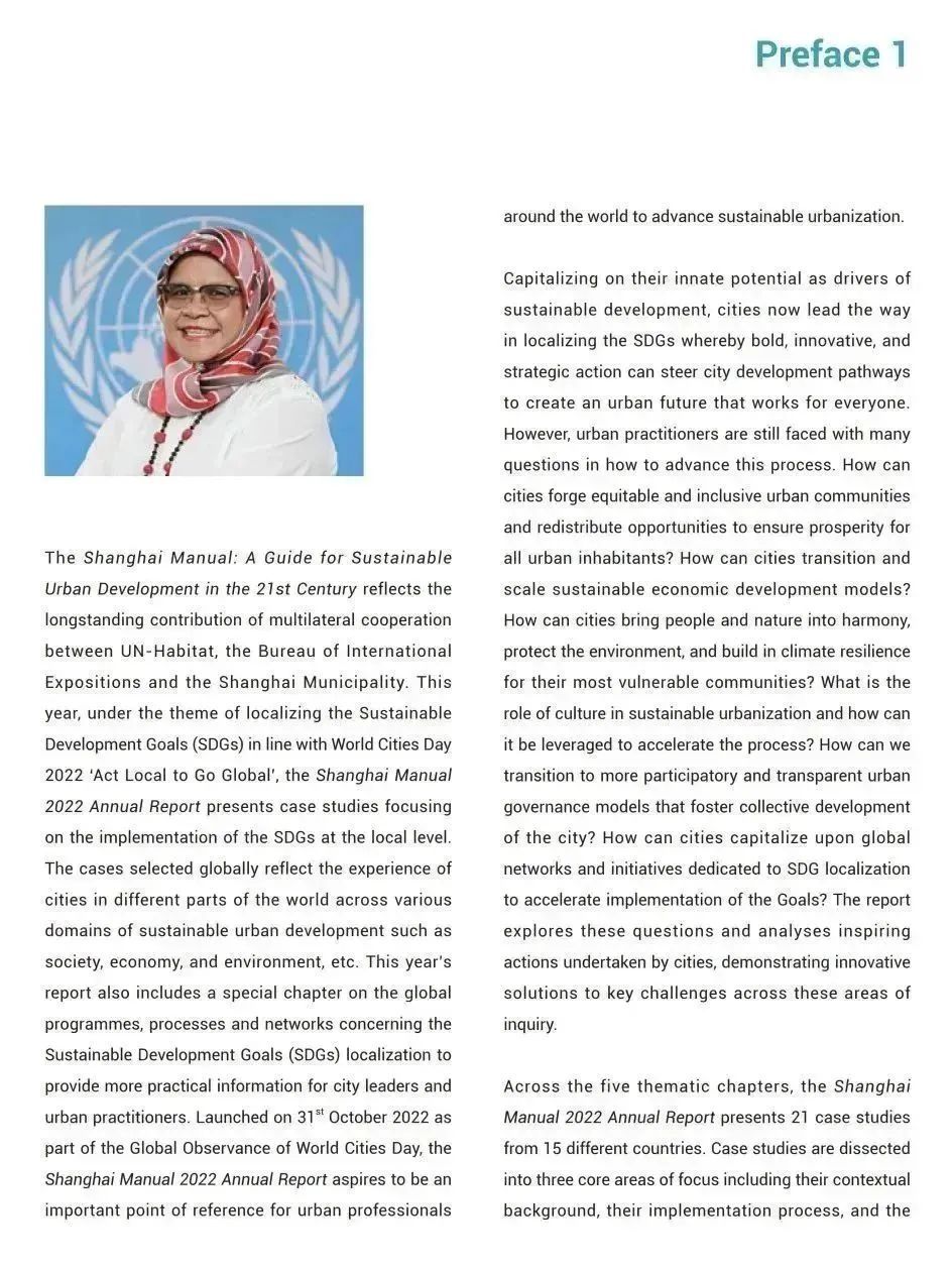 2022版《上海手册》二至六章从社会、经济、环境等可持续发展领域,遴选了21个来自世界各地的城市可持续发展优秀案例展开研究,重点介绍了案例的背景信息与实践过程,并为城市建设者提供了19条可借鉴的政策建议,帮助城市释放可持续发展目标所能创造的价值。最后一章专篇则聚焦于“可持续发展目标本地化”相关的国际平台及相关方面,包括本地化过程中涉及的全球进程,以及地方政府合作推进可持续发展目标实施过程中发挥关键作用的平台与网络。